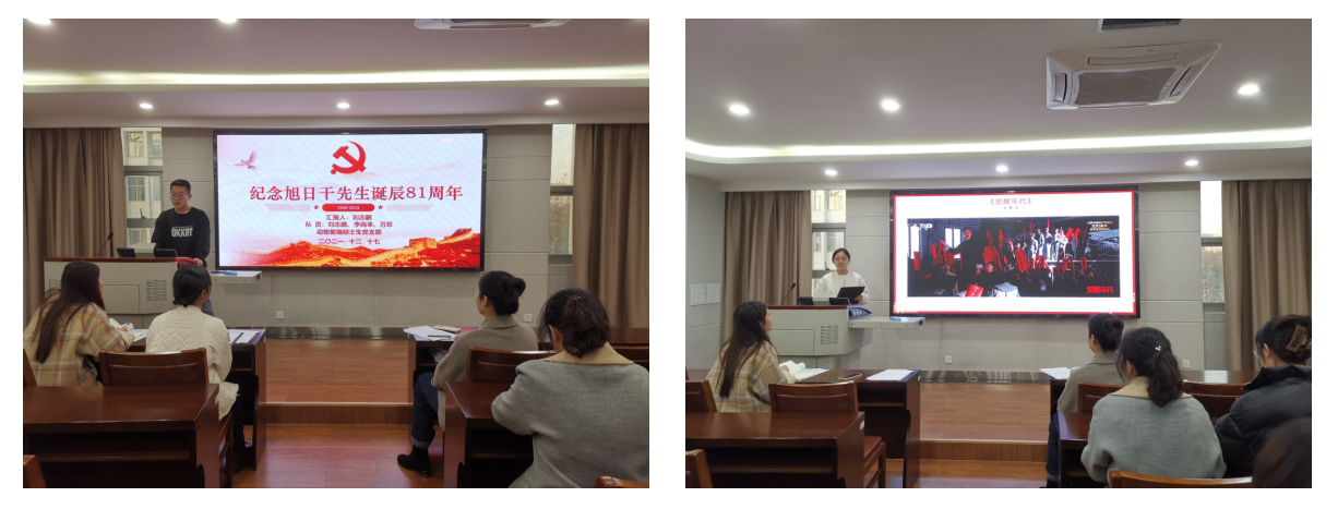 随后,在逸夫楼5077开展了“党员小组学习分享会”活动,此次活动共有三组成员参加,他们分别通过视频与PPT的形式对“觉醒年代电视剧历史背景”、“先进人物旭日干院士”及“人民军队发展壮大史”给全体党员进行了介绍,通过学习,党员们在增进交流的同时也调动了他们对红色知识学习的积极主动性。支部书樊懿萱老师对三组成员的分享表示了肯定与鼓励,她表示旭日干院士在动物繁殖领域做出的贡献对于我国农业发展的意义十分重大;旭日干院士的工作精神,值得我们每一位党员同志学习。