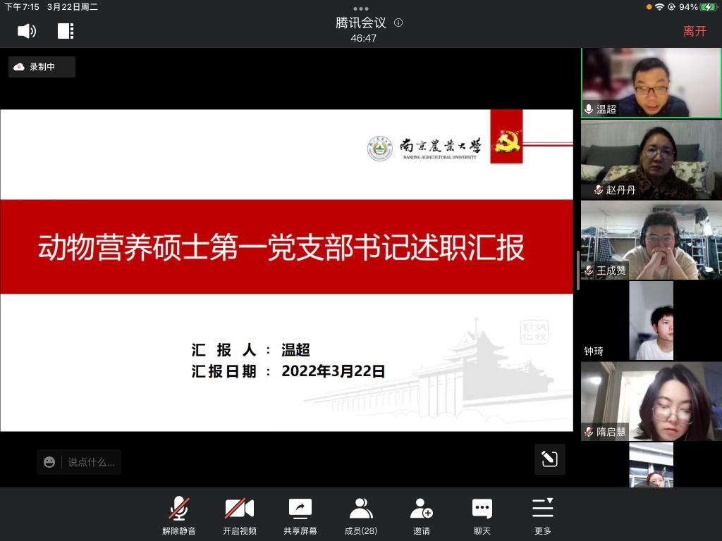 2022年3月22日晚19点,动物营养硕士生第一党支部在线上开展组织生活会和“发挥带头作用,筑牢疫情防线”主题党日活动,会议邀请了联系本支部的党员领导干部赵丹丹老师,本次会议由支部书记温超老师主持,支部党员全数参加,共29人。