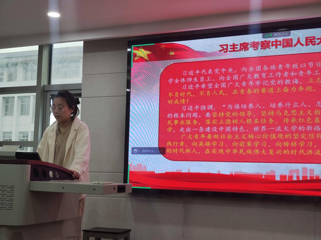议程第二项,由刘锴月、李晓璇两位同学代表所在学习小组,分享“习近平在中国人民大学考察时发言”学习心得。中国青年的奋斗目标和前行方向,是坚定不移听党话、跟党走,努力成长为堪当民族复兴重任的时代新人。要用脚步丈量祖国大地,用眼睛发现中国精神,用耳朵倾听人民呼声,用内心感应时代脉搏,把对祖国血浓于水、与人民同呼吸共命运的情感贯穿学业全过程、融汇在事业追求中。身为农科高校学生,应当牢记习近平总书记对我们青年的期盼,对待学业要脚踏实地,务实肯干,用自身的行动实践理论,努力为社会和国家贡献自己的力量。