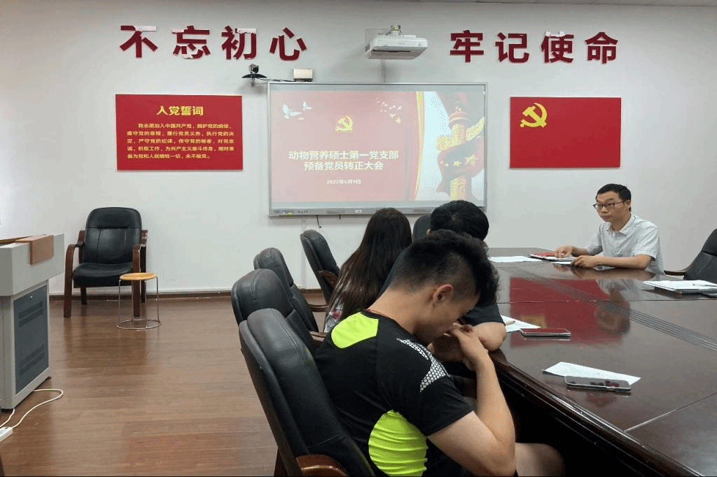 2022年6月9日14点,动物营养硕士生第一党支部在院会议室2040召开预备党员转正大会,支部共24名党员参会,其中正式党员16人,会议由支部书记温超主持。