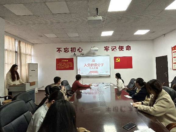 会议第一项,李梦婷、伏晨和于澳晨三位积极分子进行思想汇报,介绍自己的个人信息、学习和思想情况,经支部党员提问考察和无记名投票,本支部推选李梦婷为发展对象。