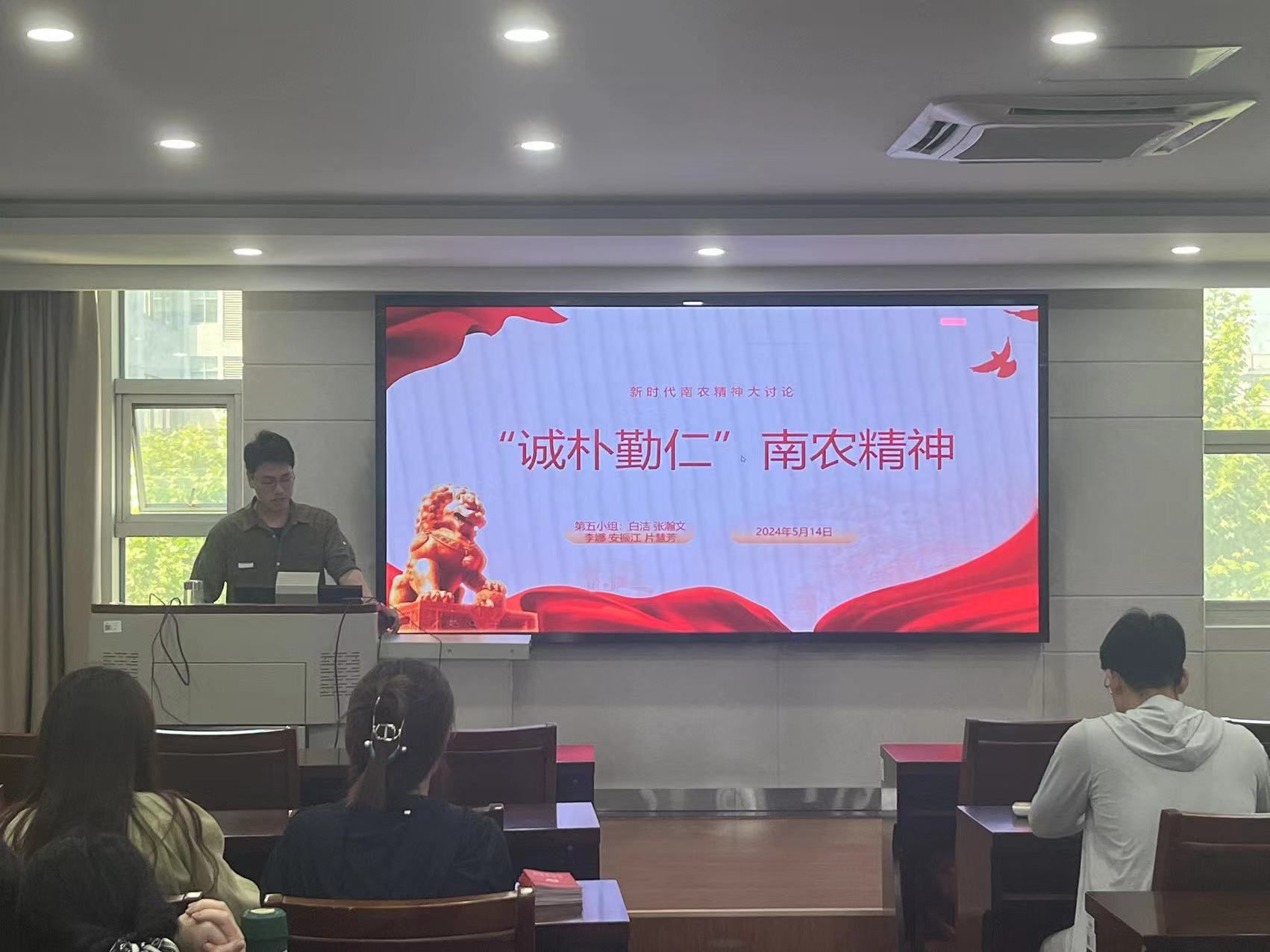 党支部第五小组以“诚朴勤仁南农精神”为主题深入介绍了南农精神的内涵,呼吁大家积极弘扬新时代南农精神,向先辈们学习,用实际行动传递南农精神力量,将南农精神发扬光大。支部党员积极讨论和交流,分享自身经历与对南农精神的感悟。