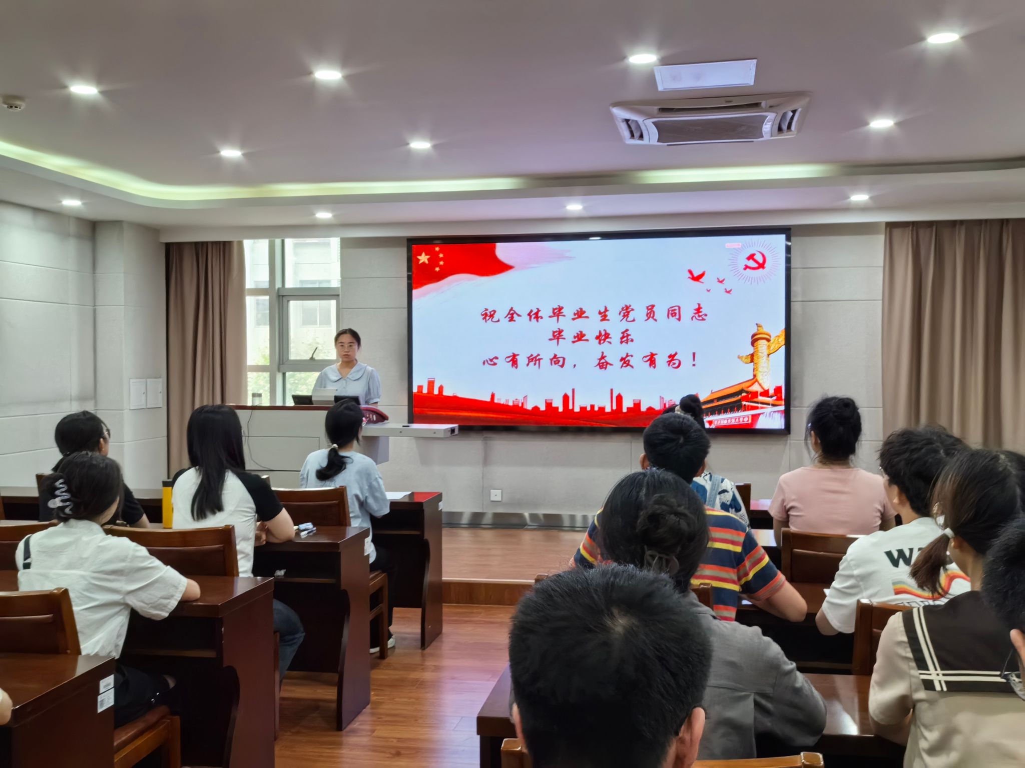 会议最后,大家一起欢送毕业生党员,由上届支部副书记秦静同志对毕业生们表示祝贺。心有所向,奋发有为,新征程上,各位党员同志应当做到学纪、知纪、明纪、守纪,时刻自警自省,砥砺初心恒心,向着既定目标勇毅前行。