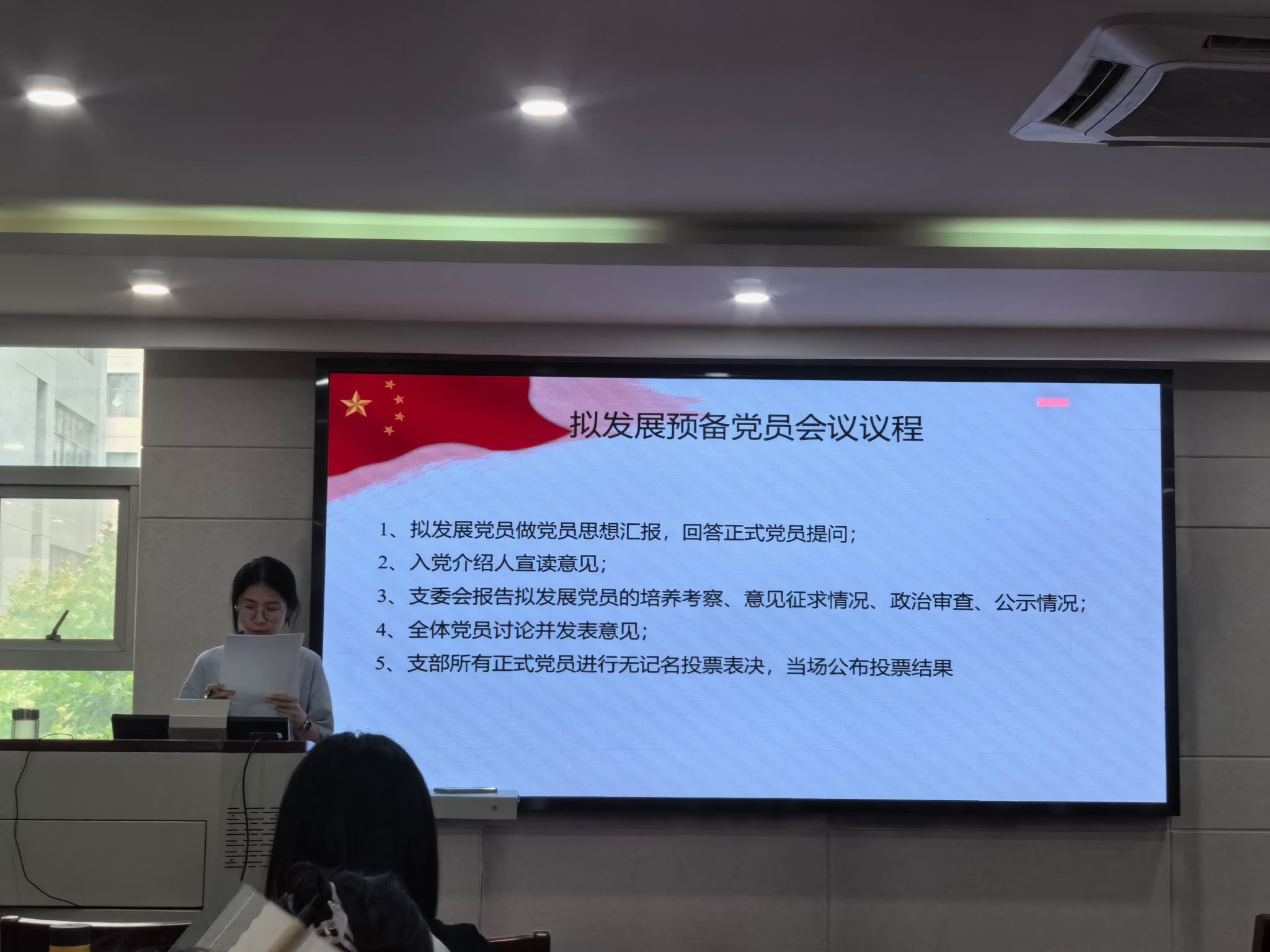 会议开始,由邓为、陶明明、朱芮雨三位同志对预备期各方面进行了全面汇报,之后,支部参会正式党员以无记名方式进行投票,参会党员全票通过三位同志转为正式党员。随后由戴纪莹、侯习盼、李璐三位同志分别对本人入党动机、个人情况和工作学习等多方面向党组织进行汇报,正式党员对三位同志进行提问,经支部正式党员无记名方式投票,全票通过三位同志接收为预备党员。