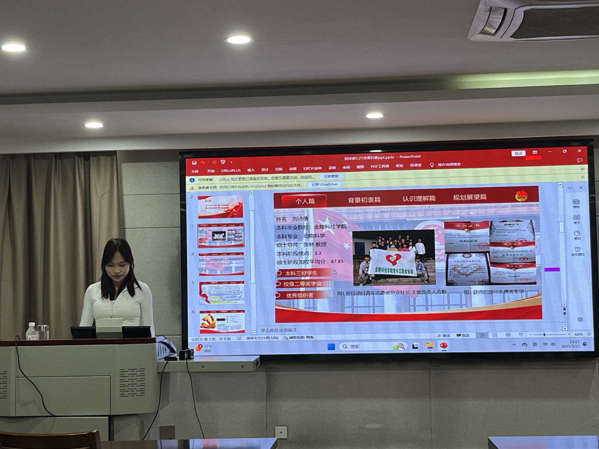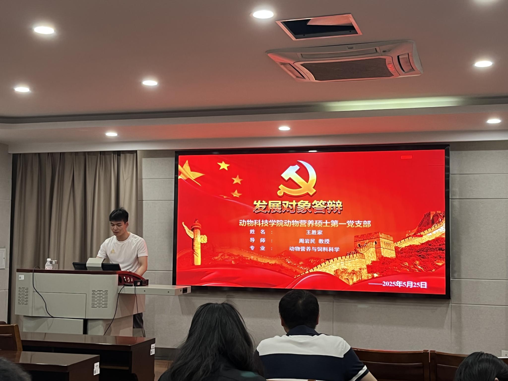 动物营养硕士生第一党支部于2025年5月25日下午13点在逸夫楼5077召开发展对象推选大会。支部学生党员参加会议,应到18人,2人请假(正式党员1位、预备党员1位),实到16人。另4位发展对象候选人,共计20人。会议由支部书记温超老师主持。