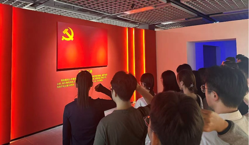 在庄严肃穆的党旗前,全体党员重温了入党誓词。"我志愿加入中国共产党..."铿锵有力的誓言在展厅内回荡,表达了同志们对党的无限忠诚和为共产主义事业奋斗终身的坚定决心。