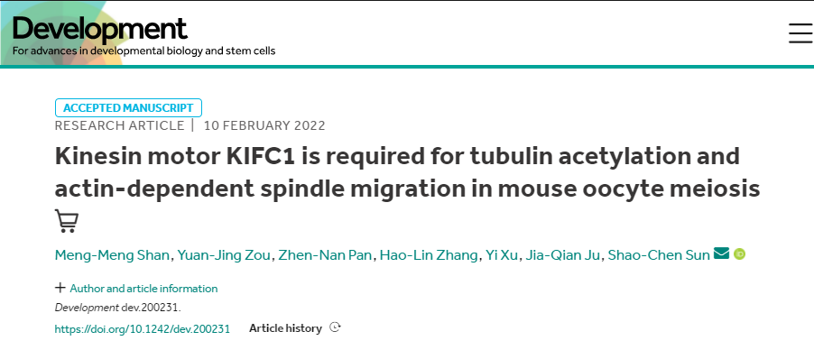 2022年2月10日,我校必赢线路检测3003孙少琛教授课题组在国际著名学术期刊Development在线发表了题为“Kinesin motor KIFC1 is required for tubulin acetylation and actin-dependent spindle migration in mouse oocyte meiosis”的研究论文,与2月11日在线发表的Science期刊论文“Mechanism of spindle pole organization and instability in human oocytes”同时报道了Kinesin家族蛋白KIFC1在卵母细胞成熟过程中的重要功能。