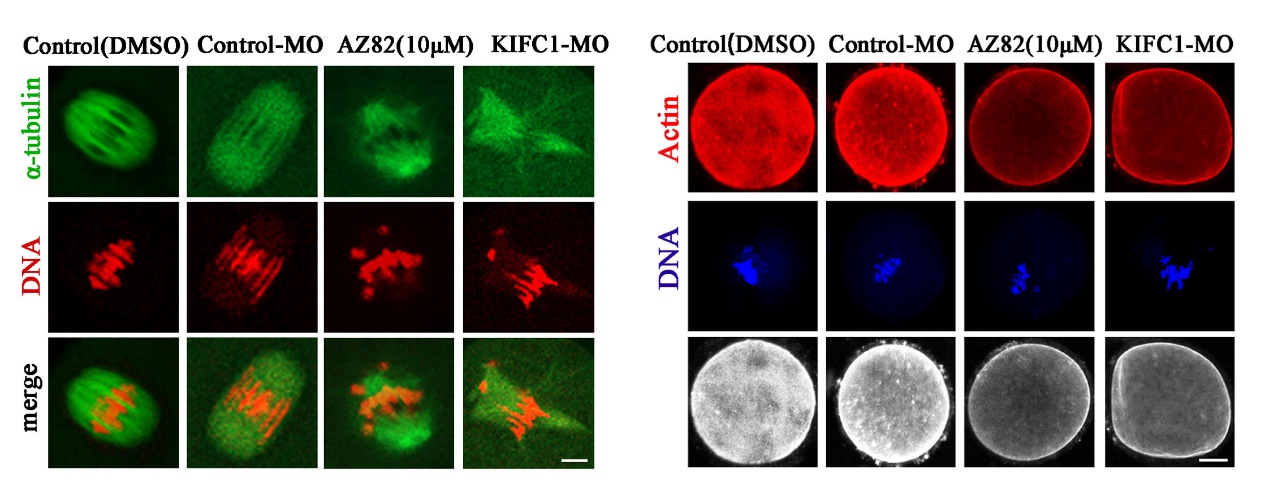 该研究不仅报道了KIFC1对减数分裂纺锤体形成的作用及分子机制,而且发现了KIFC1在卵母细胞成熟过程中参与微丝骨架调节的新功能。继课题组前期证明Rab23通过kinesin KIF17调控卵母细胞微丝动力学变化以来(Wang HH et al. Development, 2019),该系列工作拓展了在卵母细胞成熟过程中作为微管相关及依赖性的驱动蛋白kinesin家族参与微丝骨架调节的新认识。