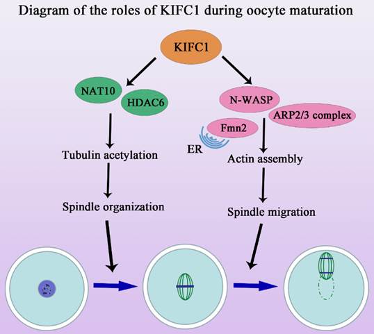 该研究发现,与有丝分裂中的作用不同的是,KIFC1除了参与减数分裂纺锤体组装外,其对卵母细胞成熟过程中的肌动蛋白动力学也至关重要。该研究采用活性抑制、敲低及外源mRNA挽救的手段,发现KIFC1不影响卵母细胞减数分裂恢复,但对于极体的排出至关重要。进一步分析发现KIFC1对于纺锤体形态的维持以及染色体的排列是必须的,且这一作用并不依赖于经典的MAPK信号通路。通过质谱分析预测及免疫共沉淀验证,发现KIFC1可能与HDAC6及NAT10等乙酰化及去乙酰化酶结合,通过运输相关蛋白影响微管的乙酰化水平参与了纺锤体的稳定性。此外,除了KIFC1传统的微管相关功能,该研究还发现KIFC1的缺失能够影响微丝的组装和纺锤体的迁移。研究结果显示KIFC1与微丝切割蛋白、结合蛋白等没有结合作用,但与两类关键的微丝成核蛋白Formin家族和Arp2/3复合物直接相关,从而影响胞质微丝的分布及皮层微丝的富集。