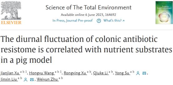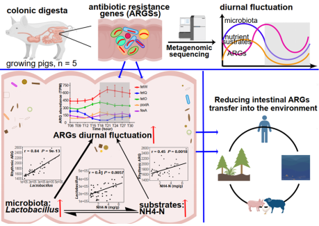 近日,我院消化道微生物研究团队在期刊 Science of The Total Environment(IF:10.754)在线发表了题为“The diurnal fluctuation of colonic antibiotic resistome is correlated with nutrient substrates in a pig model”的研究论文,揭示了猪结肠微生物抗生素(ARGs)的昼夜波动与营养底物之间的潜在关系。