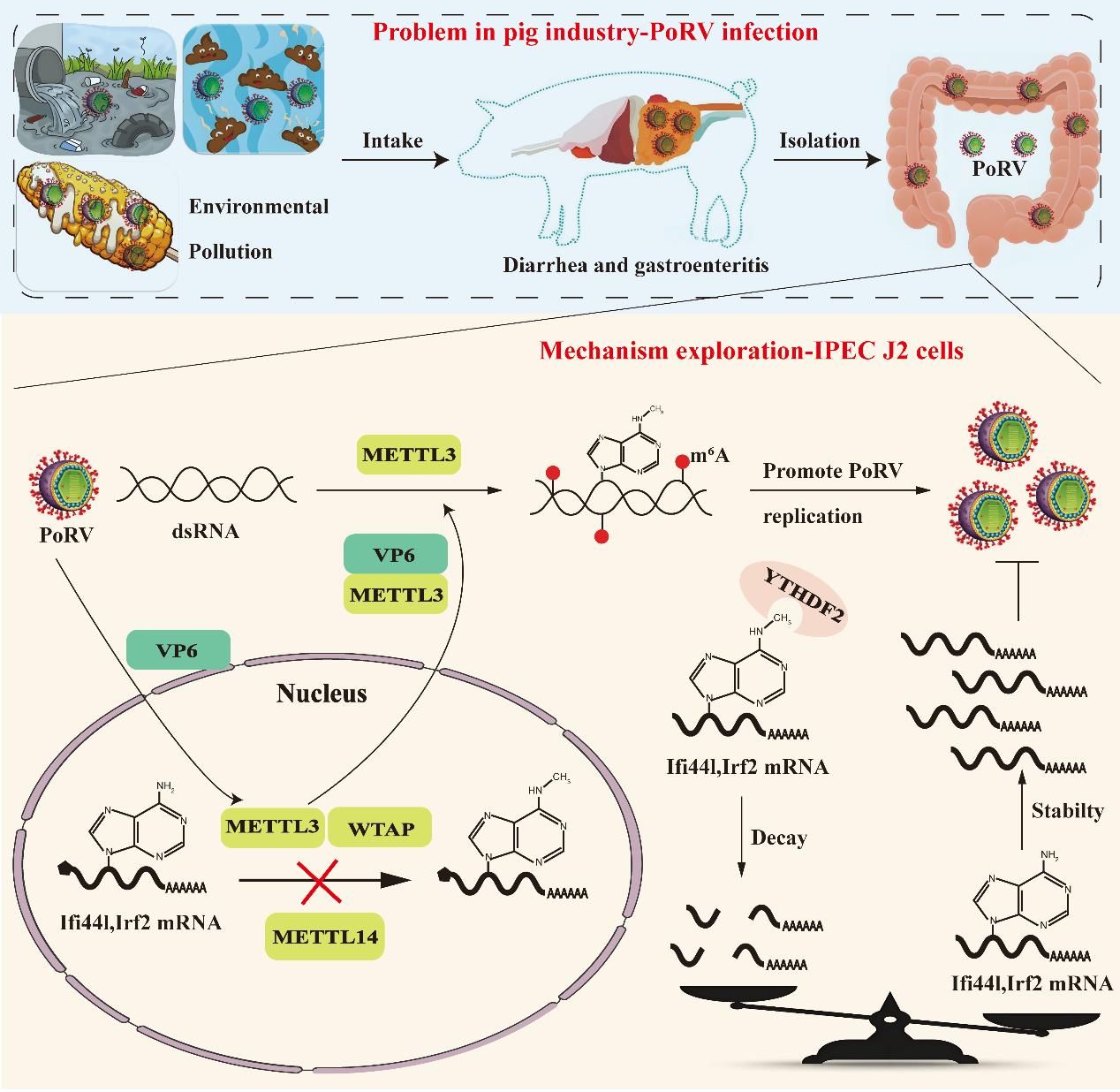 仔猪腹泻是困扰养猪业常见的难题,而猪轮状病毒(PoRV)正是导致这一产业问题的主要元凶之一,给养猪业带来了巨大的经济损失。近日,bwin必赢3003钟翔教授与江苏省农业科学院李彬研究员团队在《Cell & Bioscience》发表关于PoRV的最新研究,揭示了其通过劫持宿主细胞的RNA表观遗传修饰系统(m6A甲基化)实现自我复制,而宿主则通过主动降低m6A水平激活抗病毒防御的“攻防战”。这一发现为开发新型抗猪腹泻病药物提供了新的靶点。