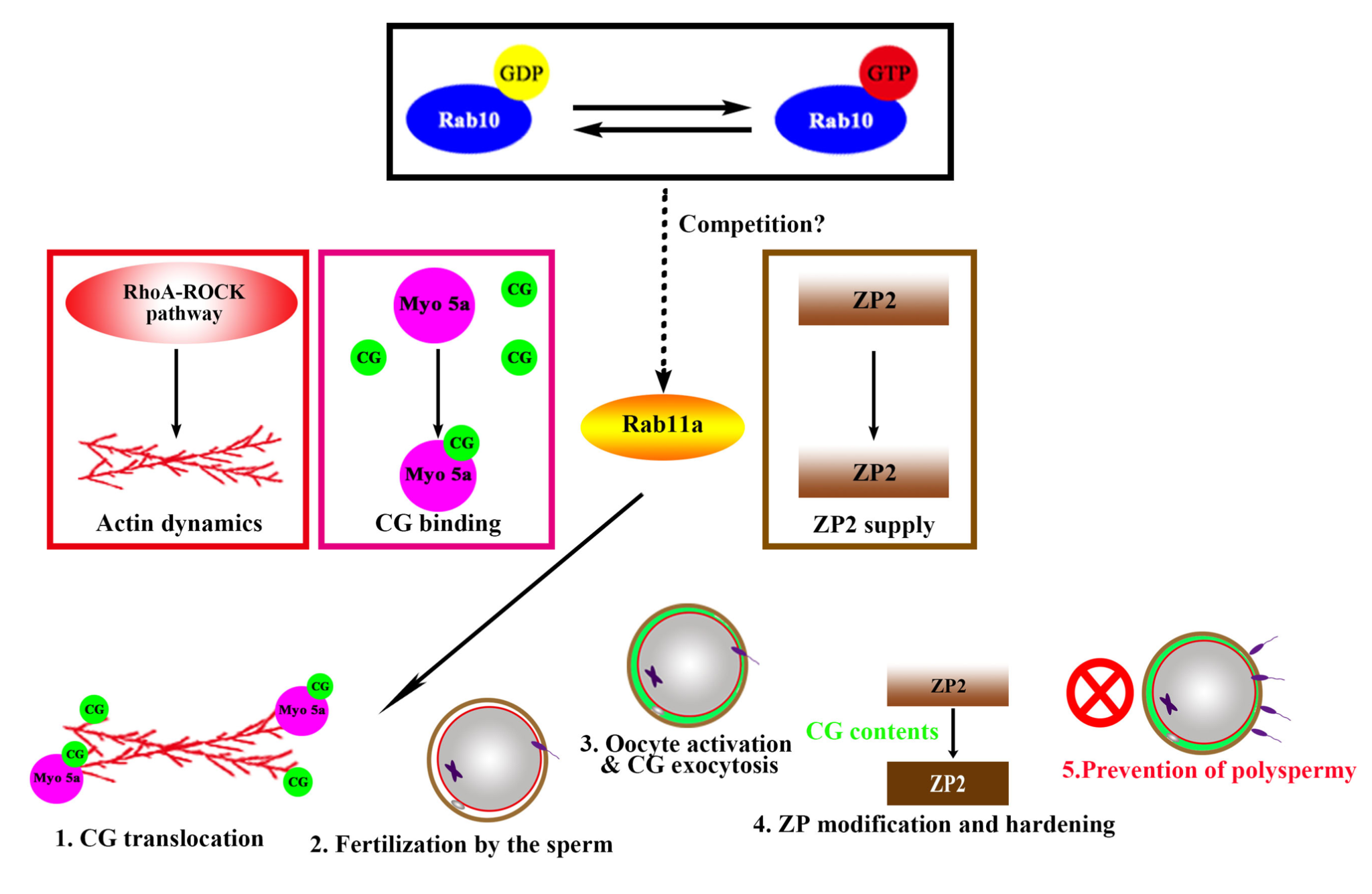 综上,本研究证实Rab10 可通过调控 RhoA 通路来调节肌动蛋白动态变化,并通过调控肌球蛋白 Va 复合物来介导皮质颗粒的转运进而影响皮质反应;同时,Rab10通过影响ZP2的分布与功能进而参与透明带反应,为保证卵子的正常受精奠定物质基础。