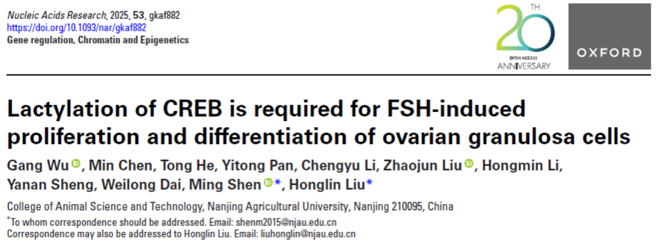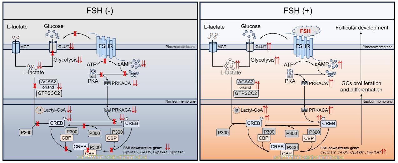 促卵泡素(FSH)是卵泡生长发育最为重要的调控因子,其通过与颗粒细胞膜上的G蛋白偶联受体FSHR结合,激活cAMP-PKA-CREB信号通路,进而促进颗粒细胞增殖与分化。论文研究发现,FSH对颗粒细胞的增殖与分化的促进作用依赖于乳酸生成与乳酸化修饰;抑制乳酸生成或阻断乳酸化修饰,均能抑制FSH诱导的颗粒细胞增殖与类固醇激素合成。