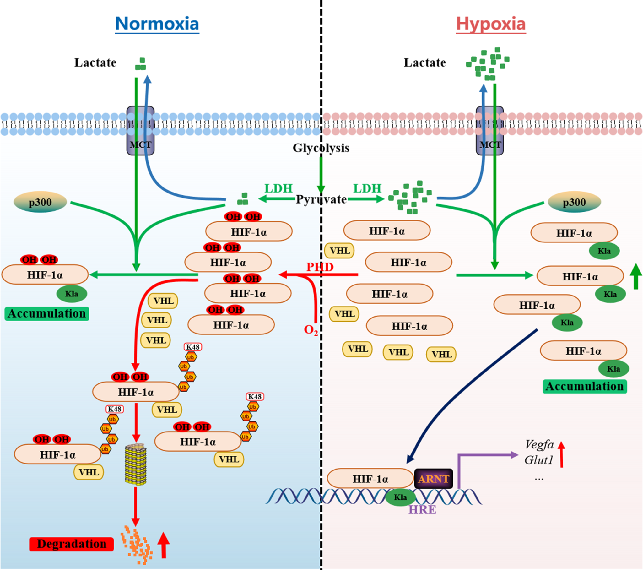 低氧诱导因子HIF-1α是细胞感知和应答低氧环境的核心调控因子,主要通过调节与低氧适应相关的基因表达,参与细胞的代谢调节、血管生成、细胞增殖及存活等生理过程。通常情况下,HIF-1α在常氧下被迅速降解,而在低氧条件下稳定存在。论文研究发现,常氧下添加乳酸能通过抑制HIF-1α降解稳定其蛋白水平。此外,研究还发现乳酸化的HIF-1α具有更强的转录活性,能更有效地招募至靶基因(如Vegfa)启动子并激活转录。