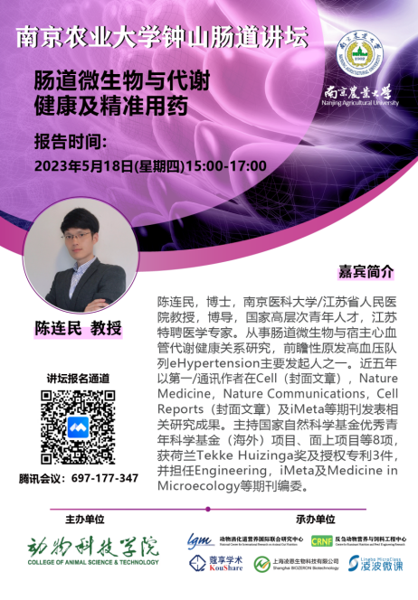 2023518,我们将推出南农大动科学院钟山肠道讲坛系列讲座第五讲,特邀南京医科大学—陈连民教授为大家带来《肠道微生态与代谢健康及精准用药》的分享内容。