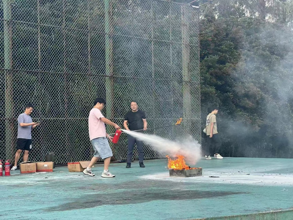 讲座过后,老师们带领学生到文化广场进行消防演练,对正确配带防护面罩及灭火器的使用方法进行说明与演示。每位同学都逐个亲自体验,现场进行了灭火器的实操演练。