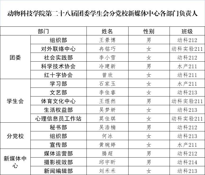 经过各竞聘候选学生个人申请,学院学生干部换届工作小组对相关候选学生的考察,并报请学院党委同意,现将必赢线路检测3003第二十七届团委、学生会、分党校、新媒体中心各部门负责人名单公示如下: