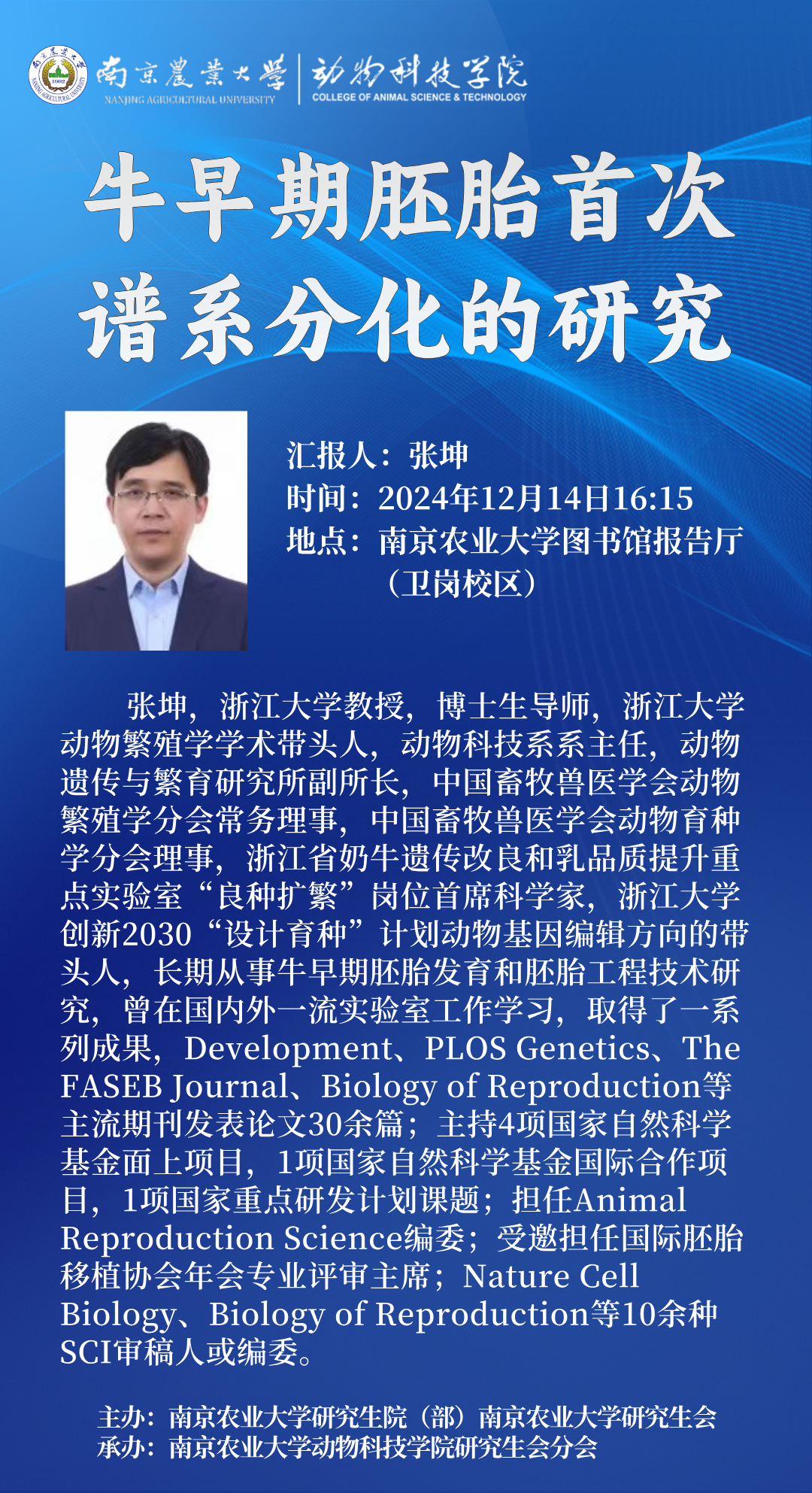 牛早期胚胎的首次谱系分化是动物繁殖学领域的重要研究方向,对于深入理解牛胚胎发育机制、提升繁殖效率以及优化育种策略具有重大意义。本次报告中,浙江大学动物繁殖学学术带头人张坤教授,将作题为“牛早期胚胎首次谱系分化的研究”的学术报告。他将为同学们详细解析牛早期胚胎谱系分化的关键分子机制,分享其在胚胎工程领域的研究进展,并介绍这些研究成果如何在现代奶牛育种实践中发挥作用。本次报告旨在让同学们了解动物胚胎发育的前沿知识,掌握与牛育种和繁殖相关的重要技术,为未来的学术研究与职业发展提供科学指导。