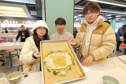 “饺你太美·创意大比拼”则是一场视觉与味觉的双重盛宴。同学们巧妙地利用提供的胡萝卜、香菜、西兰花等食材,尽情发挥创意,制作出了一盘盘造型独特的饺子。有的小组将饺子精心摆成了校徽的模样,有的小组则巧妙地呈现出一幅生动的海底景色。值得一提的是,外国友人的加入使这一环节呈现出国际化的特色。他们不仅兴致勃勃地学习了如何包饺子,还大胆尝试用蔬菜来装饰饺子,创作出别具一格的饺子形状,这让在场的每一个人都深切感受到了文化交流的乐趣与魅力.