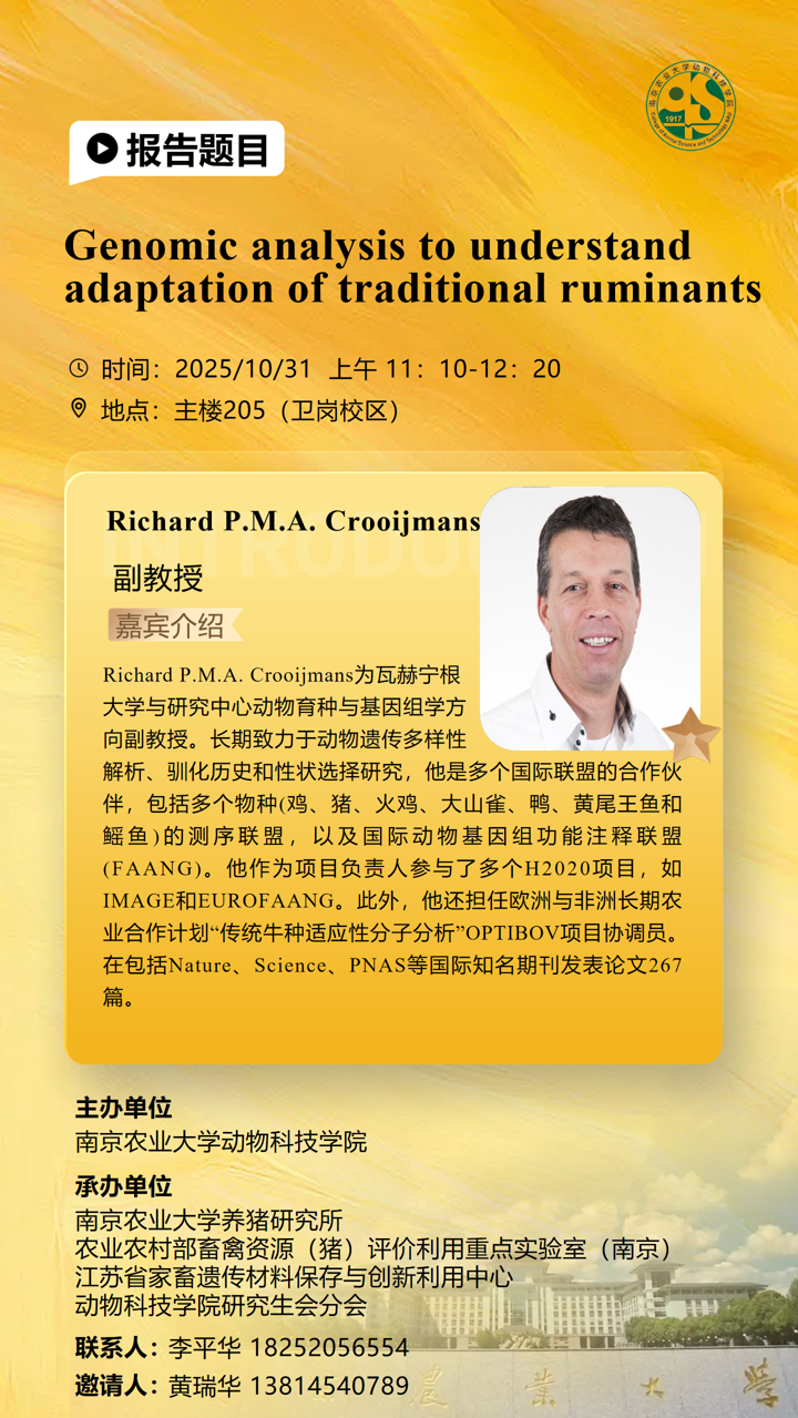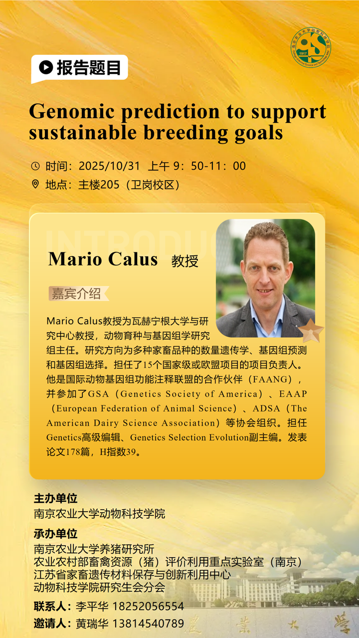 2025年10月31日,荷兰瓦赫宁根大学与研究中心Mario Calus教授和Richard P.M.A. Crooijmans副教授连袂主讲,将带来两场紧扣动物育种和基因组学方向前沿的专题讲座。一场关于未来的探讨,一场关于起源的追溯。欢迎广大师生踊跃参加!