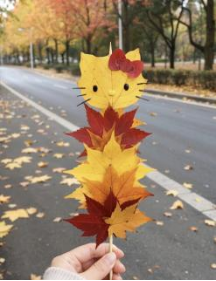 3人一组,手提小篮捡拾秋日落叶——或许是边缘微卷的银杏叶,或许是脉络清晰的梧桐叶,每一片“不完美”都藏着独特韵味。用胶水、剪刀将落叶组合,在硬卡纸上共同创作专属画作,分享彼此的创作理念,在协作中感受“和而不同”的智慧