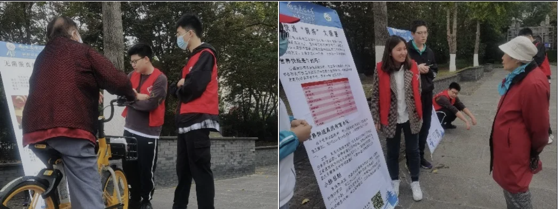 我院同学对这次活动积极参与,尽管天气降温,但同学们热情不减,到达下马坊公园,兴致勃勃地搭建起展板并开始讲解。由于今天的风比较大,展板有时候会不稳固,但大家都不约而同地一直扶着展板给行人展示。