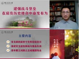吴峰从“党支部的前世今生和经验启示”“基层党支部发挥战斗堡垒作用”“青年要立志鸿鹄之志成强国伟业”三个方面进行讲述。他首先从党支部建设的历史经验和党支部发挥的职能价值出发,阐述作为一名基层支部党员应当如何践行初心使命,彰显青春当担。中国共产党党员总数为9514.8万名,其中大学生党员有306万人,我们作为中国共产党的中坚储备力量应当建强支部战斗堡垒,在肩负历史使命中奋发有为。中国共产党的基层支部制度于1925年党的四大正式提出,并于次年提出“一切工作归支部”的口号。改革开放以来党支部建设经过调整加强、全面发展、深化提升这三个发展阶段,为我们如今的支部建设积累了大量经验启示。吴峰总结到在强化基层党支部建设过程中,在树立导向、工作部署、效果检验等方面要做到六个“必须”。