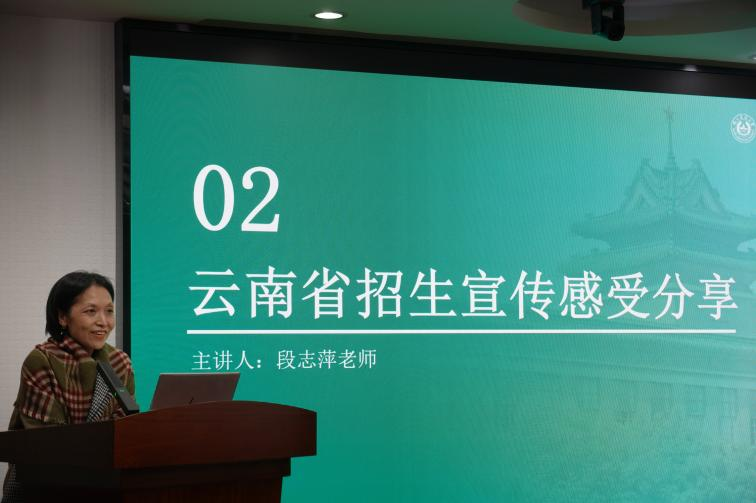 段志萍老师分享了她去云南招生宣传的感受。同时,段老师在如何成为优秀的南农学子这个问题上提出了许多建议,让同学们受益匪浅,并且希望同学们能够早日确立自己的理想和目标,为自己的大学生活交一份满意的答卷。