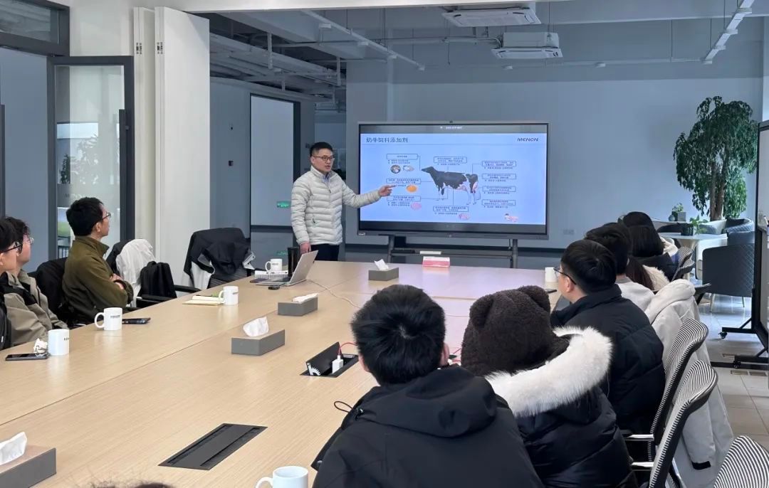 产品经理王恒专门就美农公司奶牛饲料添加剂产品如缓释氮源、过瘤胃葡萄糖、过瘤胃氨基酸等分别展开了详细介绍,美农公司以精准释放、高效利用、绿色安全等特质实现产品的全球领先性,于多方面、多适用场景落实奶牛健康福利保护。