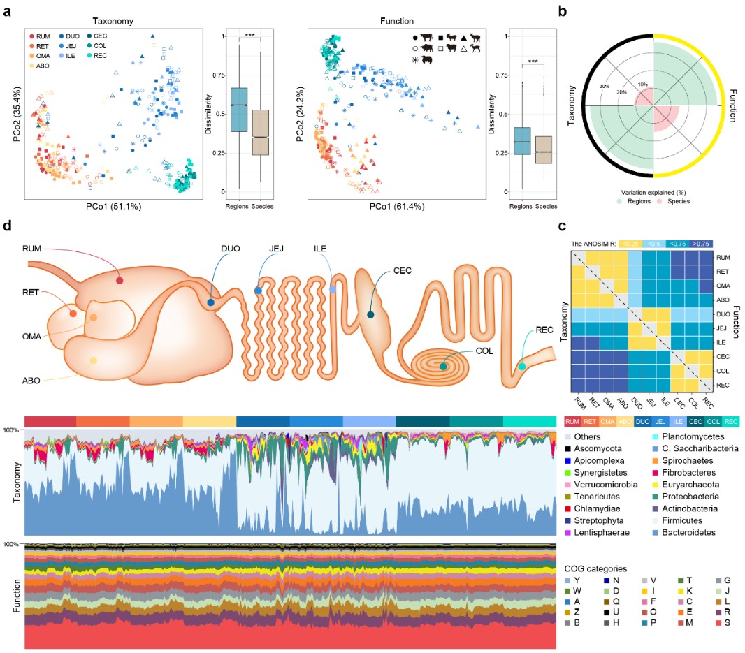 反刍动物能够利用植物纤维物质生产肉和奶等高营养价值的食品,其主要取决于反刍动物消化道微生物群落的特殊结构与功能。长期以来,人们重点研究了反刍动物瘤胃微生物的菌群组成和功能,但近年来研究人员发现,反刍动物小肠和后肠微生物对饲料效率和宿主健康也具有重要作用。为阐明反刍动物全胃肠道微生物组的结构和功能,明晰其与宿主健康及饲料效率间的内在关联。项目选取了7种代表性反刍动物,包括奶牛、水牛、牦牛、山羊、绵羊、狍子和獐子,分别采集了这些动物全胃肠道10个区段的食糜样品,对370个样品进行了宏基因组测序。项目首次构建了反刍动物胃肠道微生物基因集(非冗余基因>154 M),该基因集为反刍动物胃肠道微生物组的研究提供了参考,同时为跨物种和多领域的微生物组比较研究提供了数据支撑。项目同时组装了超过10,000个非冗余的微生物基因组,在种水平上鉴定出了8,745个新基因组,这些基因组极大的拓展了反刍动物消化道微生物基因组资源,在分类学上大幅提升了对反刍动物消化道微生物的分辨率,这些新发现的微生物资源对反刍动物消化道微生物的分离培养、甲烷减排和高效生产的研究提供了新的支撑。