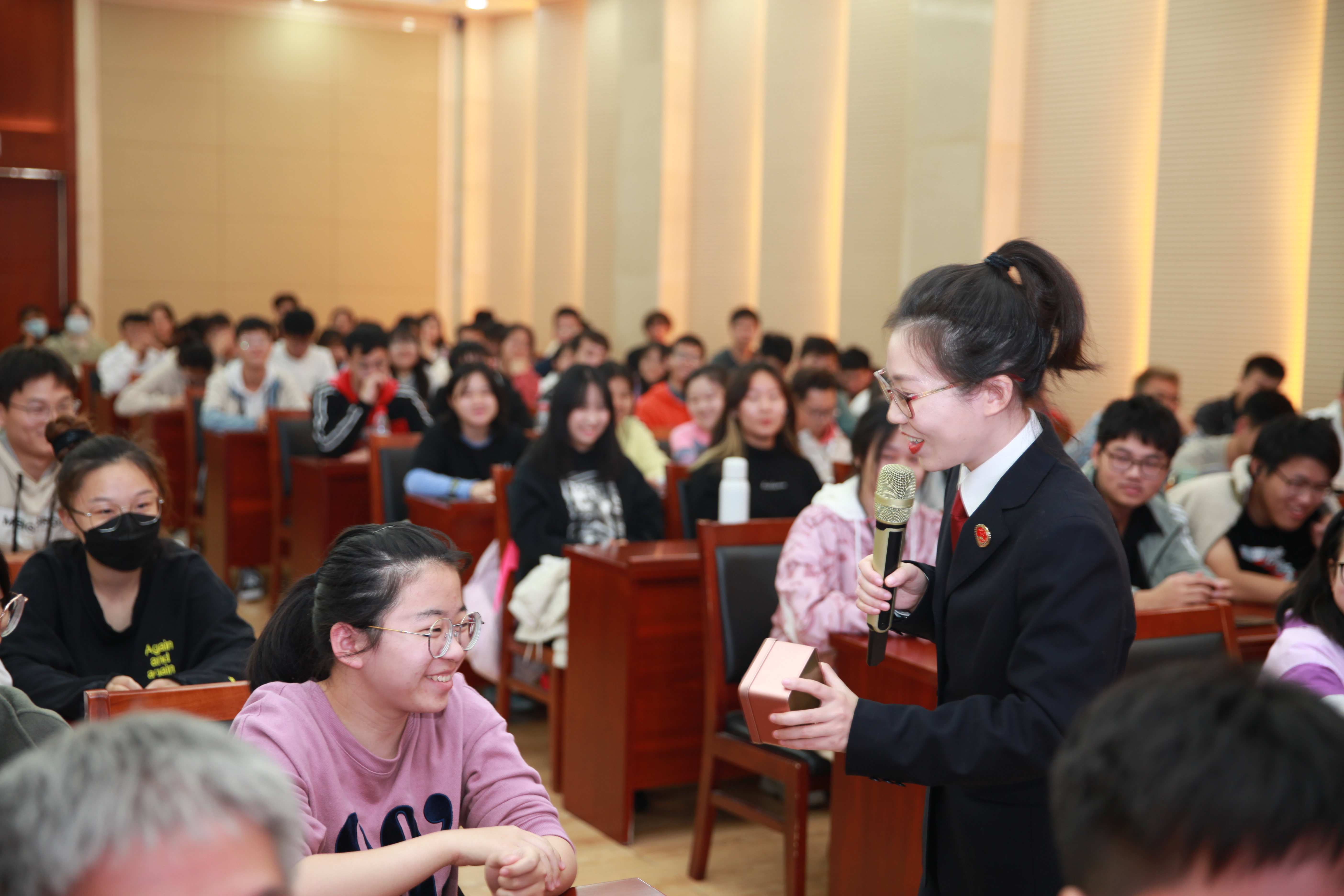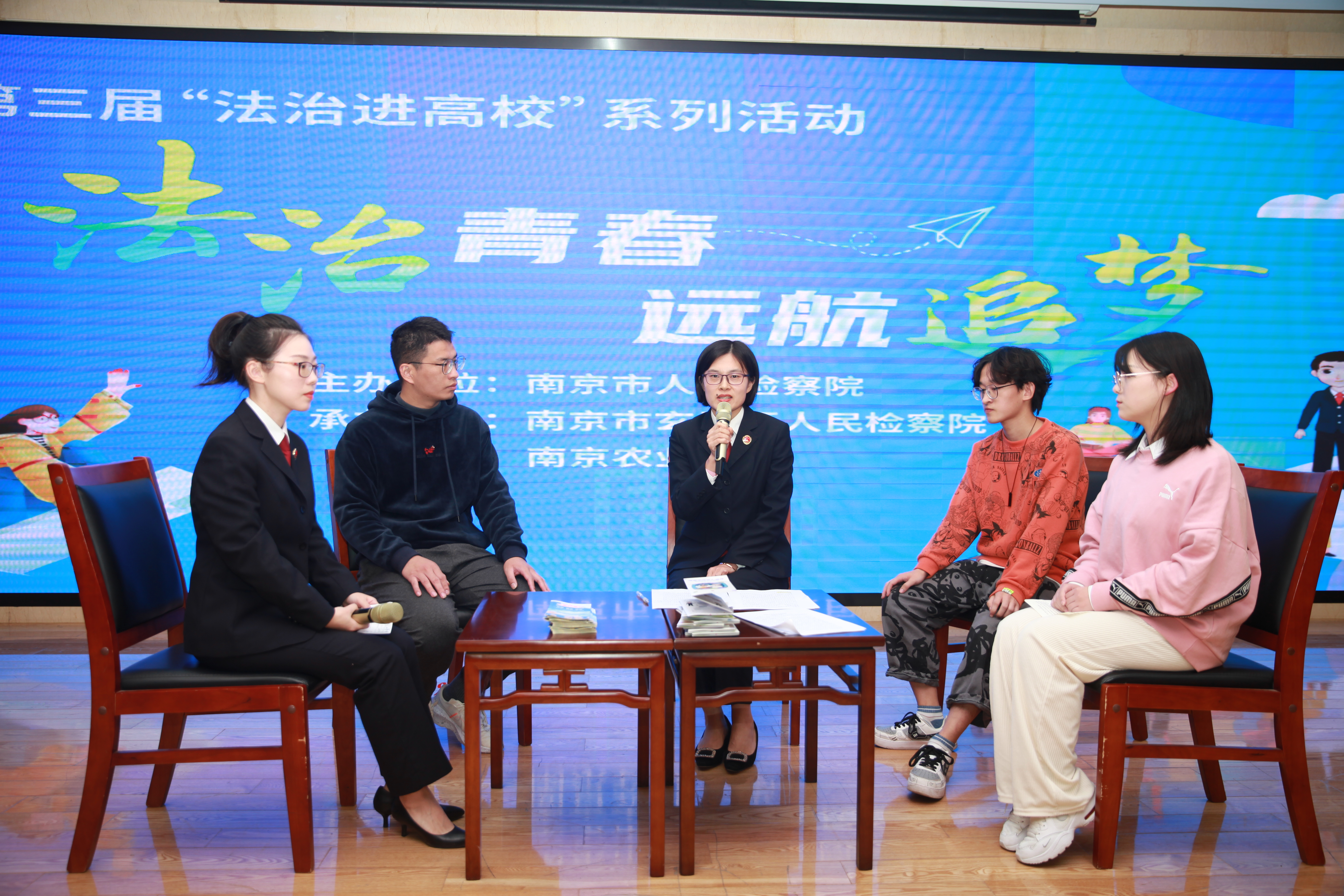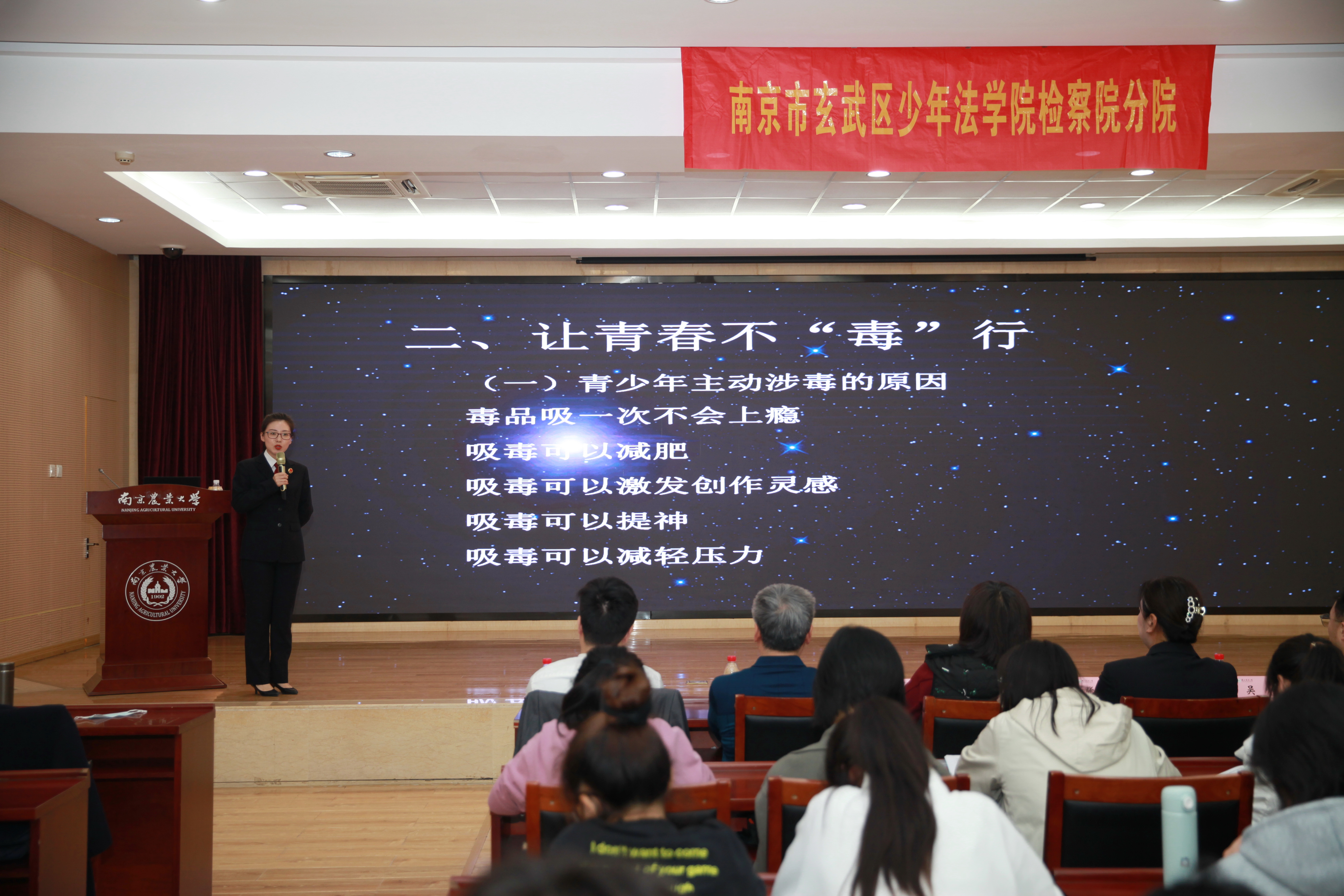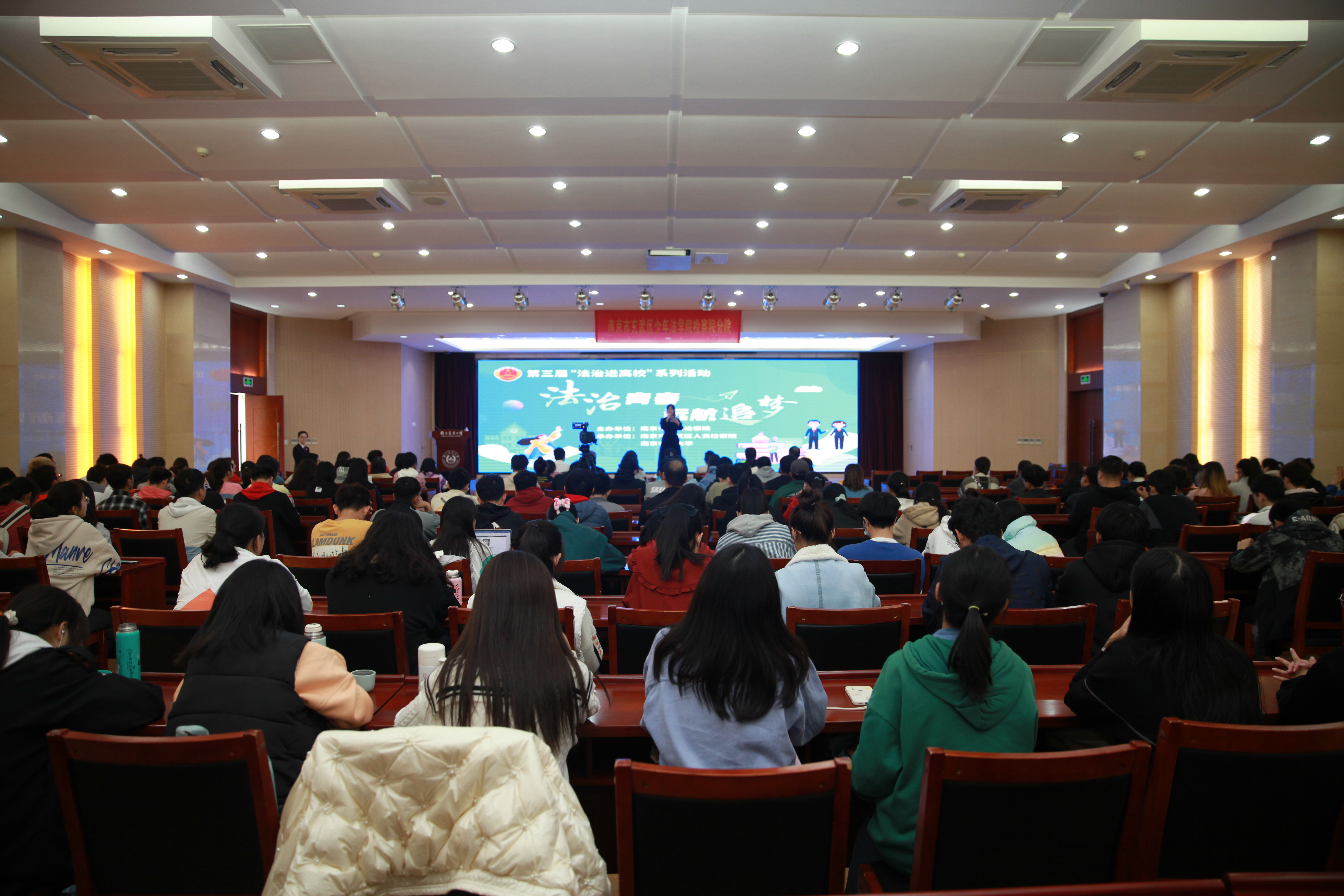 本次法治宣传活动共有三个环节,首先是“我的案件我来说”环节,玄武区检察院唐顗现身说法,从检方近几年的案例开始,以网络安全、套路贷为主题进行了案例演说,年轻检察官们通过一个个法治小故事,深入浅出的向同学们讲授了网络犯罪、套路贷犯罪方面的法律知识。随后检察院为大家播放了检察院资质的教育系列片“青春·正步走”,通过短片的形式讲述了网络贷、校园贷的套路和危害,发人深省。
