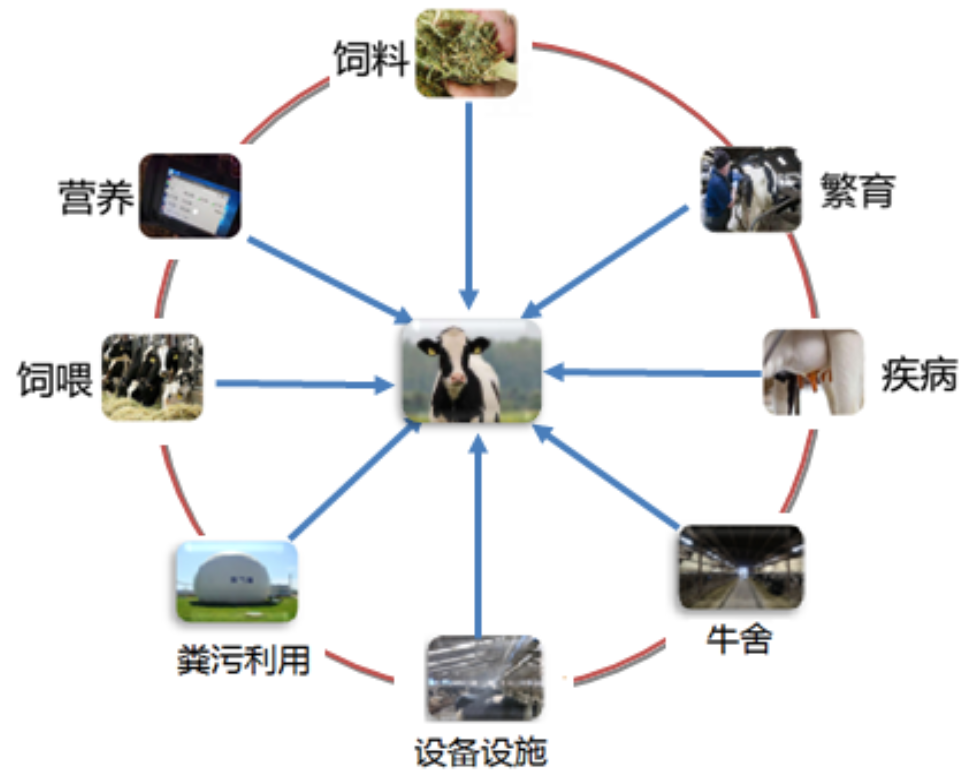 系统思维是人们从系统的角度系统地认识事物的各个方面及其结构和功能的一种思维方式。整体性原则是系统思维的核心。这一原则要求,无论人们做什么,都要立足于整体,从整体与局部、整体与环境的互动中理解和把握整体。现代化、规模化奶牛场的运作要以动物学、畜牧学、家畜环境生态学、农业建筑学及动物行为与福利学等为理论依据, 用整体化系统化思维进行研究设计, 对奶牛场饲养工艺、设备选型、饲养场地和建筑等进行整体系统的分析。在课程讲授过程中,培养学生的系统化思维,把点串联起来成为一个整体(下图)。使得学生在看到一个规模化正常运转的奶牛场时,有整体化系统化的思维,并能发现流程各个环节中存在的问题。