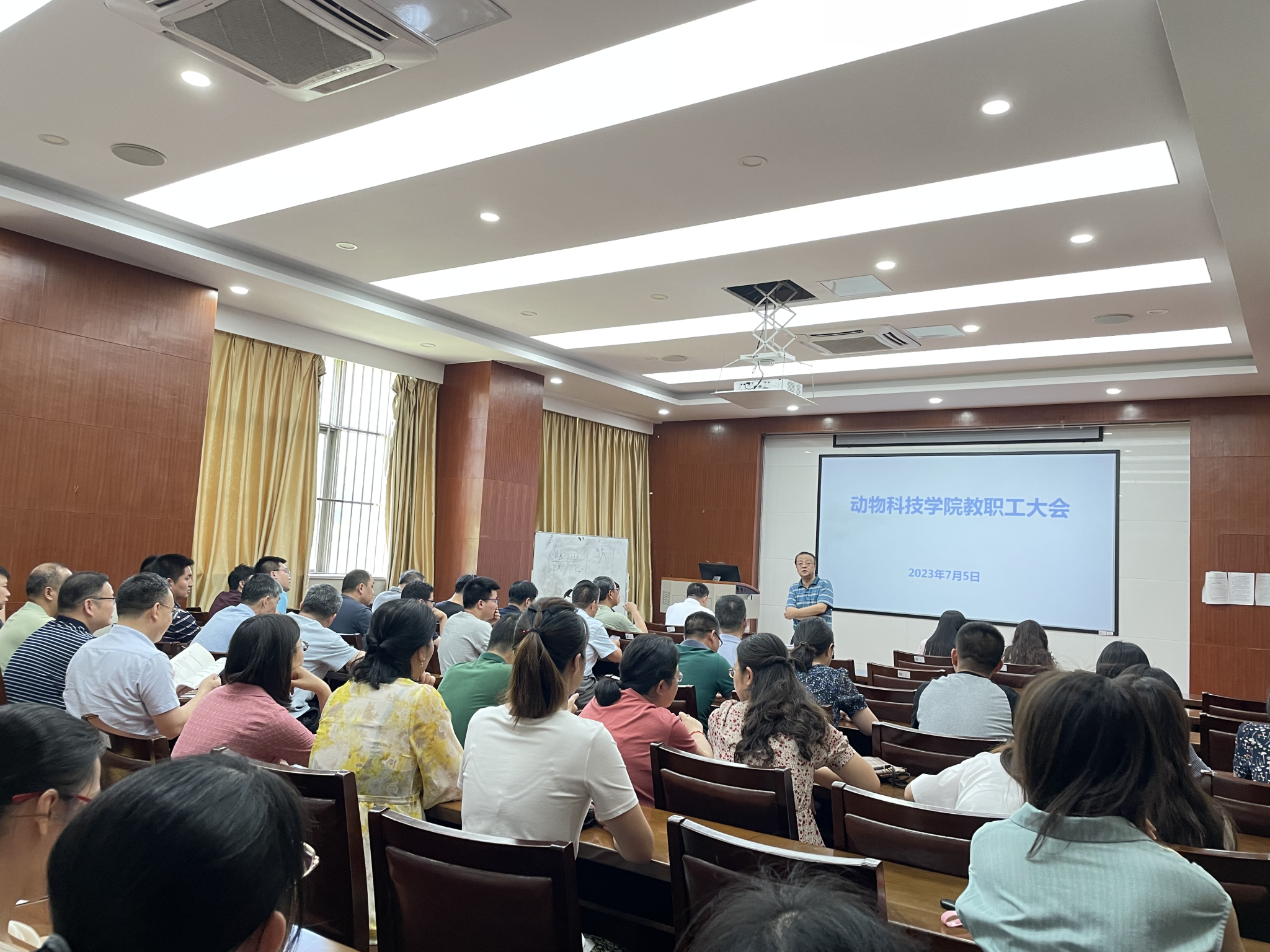 会议第二部分,毛胜勇围绕畜牧学第五轮学科评估总体情况、人才培养质量、师资队伍与资源、科学研究水平以及社会服务与学科声誉五个方面进行分析,指出学院欠缺短板,希望全院共同努力,全面提高学院科学研究水平,优化师资队伍建设,提高人才培养质量及社会服务能力,提高学科声誉。