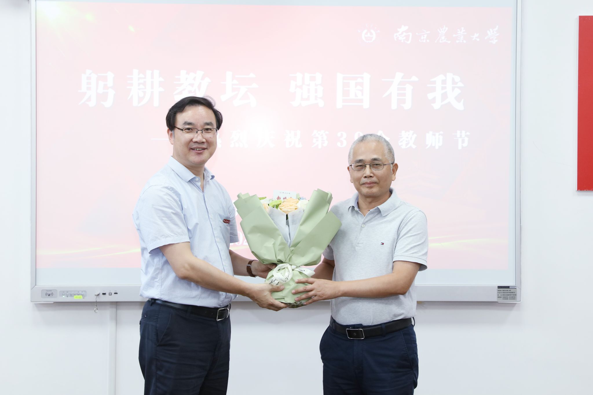 闫祥林向2023年师德标兵黄瑞华老师颁发荣誉证书和奖杯,为教师代表朱伟云、刘文斌、张定东和李平华送上鲜花。闫祥林代表学校,向教师代表致以节日的问候,感谢老师们在教书育人、科研创新和学校建设事业中做出的贡献。他表示,一直以来,学校高度重视教师工作,始终从推动学校事业发展的战略高度去谋划和布局教师工作,全面加强教师思想政治和师德师风建设,推动建设高水平教师队伍,为学校事业高质量发展提供强有力的支撑。他希望广大教师不忘初心、牢记使命,将国家战略、教育使命、学校事业和个人成长紧密结合起来,努力培根铸魂育新人,为我校各项事业的建设与发展再作新贡献。