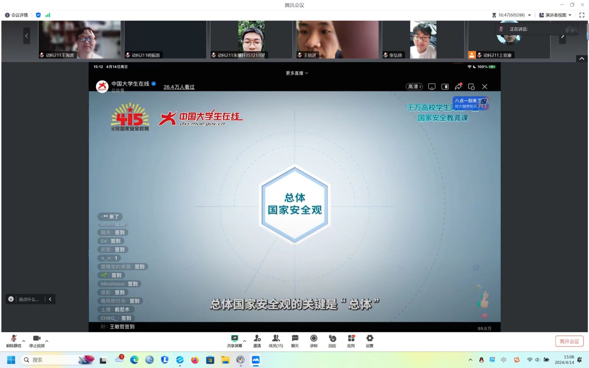 2024年4月14日下午15点,我院组织本研学生线上观看学习“千万高校学生同上一堂国家安全教育课”主题公开课。学院本研学生以支部为单位组织观看学习,其中共75位学生代表前往逸夫楼2064开展线下集体学习。