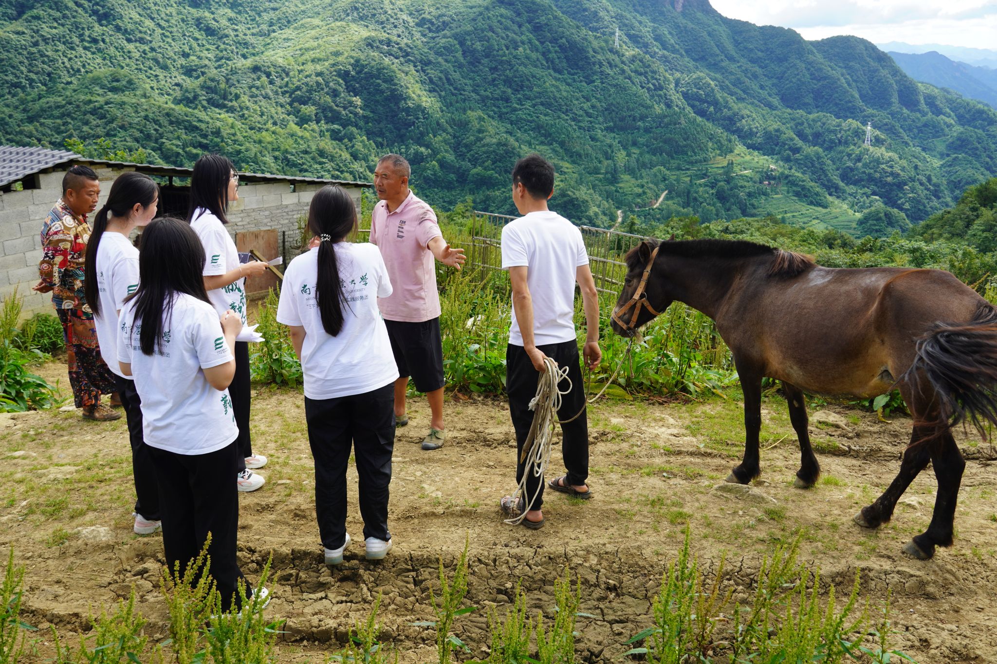 调研主要针对水城村养殖业的养殖模式、规模、疾病防控、粪便治理等展开。罗传彬带领实践团参观水城村山顶“天然牧场”。据悉,目前水城村约有1500多只羊,500多匹马,800多头牛,养殖规模较大,养殖成本低廉,粪便直接作为大山的肥料,有很高的经济效益和良好的发展前景。
