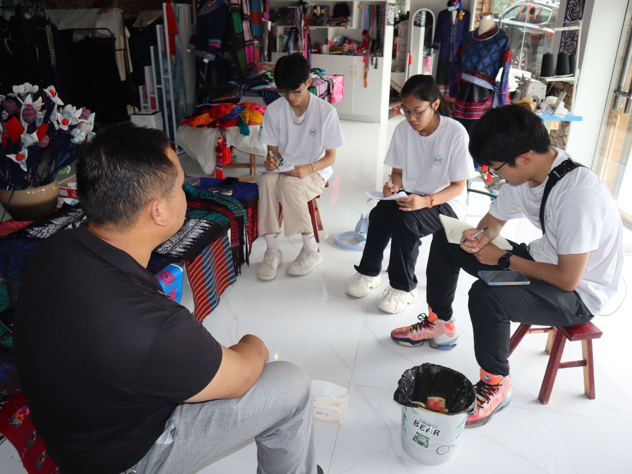 河坝村副支书龙全成向实践团介绍河坝村的主要产业有生猪养殖、林下养鸡、蓝莓种植、蔬菜种植(辣椒,生姜)以及非物质文化印染——枫香染。河坝村养殖户表示,南农动科院黄教授会定期指导生猪养殖和林下养鸡,并每年进行养殖技术人员的培训。据村民分享,在bwin必赢3003派驻河坝村原第一书记陈宏强的推动下,河坝村原来的枫香染小作坊改组成为公司,带动了400余人的就业工作,并在南农的帮扶下拓宽了销路,助力非遗出山,把产品卖向江苏、浙江等地。