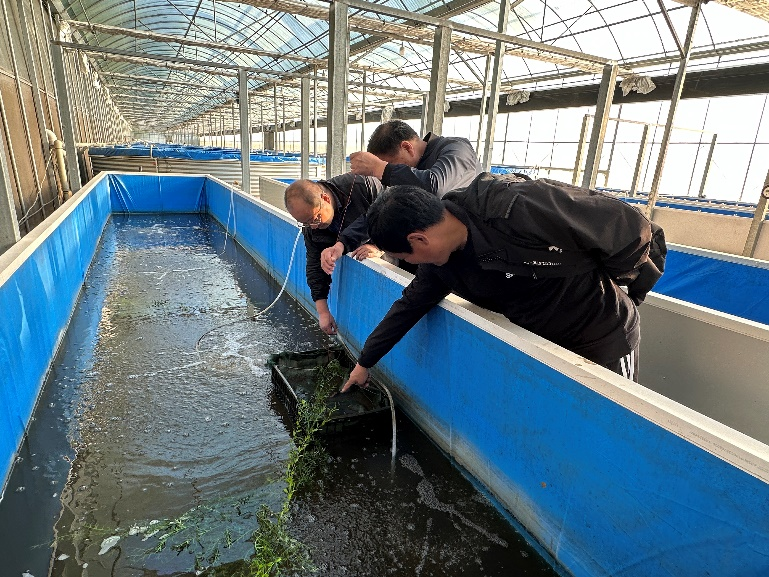随后,青虾团队前往可欣家庭农场,与负责人蔡总继续交流青虾养殖技术。团队针对农场的具体情况,提供了个性化的养殖建议和技术支持,并就今年开展养殖新模式“青虾套养花鲢“、”青虾套养鸭嘴鱼“的效果进行了检查。基地负责人蔡总还反映,本团队研发的青虾专用饲料与对照饲料相比,诱食效果好、吃食量大、青虾生长快、规格大。