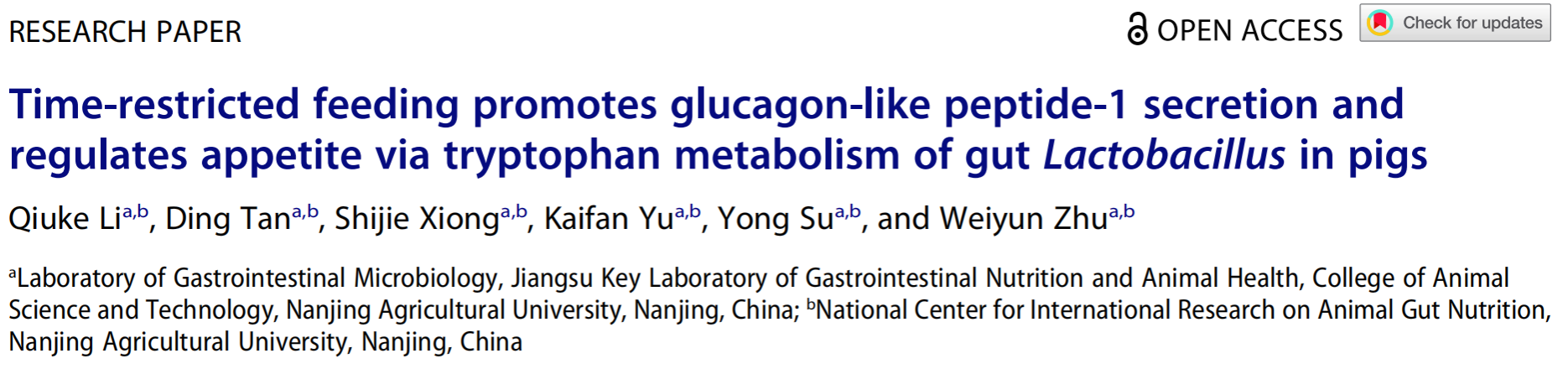 2月15日,我院消化道微生物团队苏勇教授和余凯凡副教授在《Gut microbes》发表了题为“Time-restricted feeding promotes glucagon-like peptide-1 secretion and regulates appetite via tryptophan metabolism of gut Lactobacillus in pigs”的研究论文,该文揭示了限时饲喂模式通过肠道乳酸菌的色氨酸代谢影响生长猪GLP-1分泌和食欲调节的新机制。