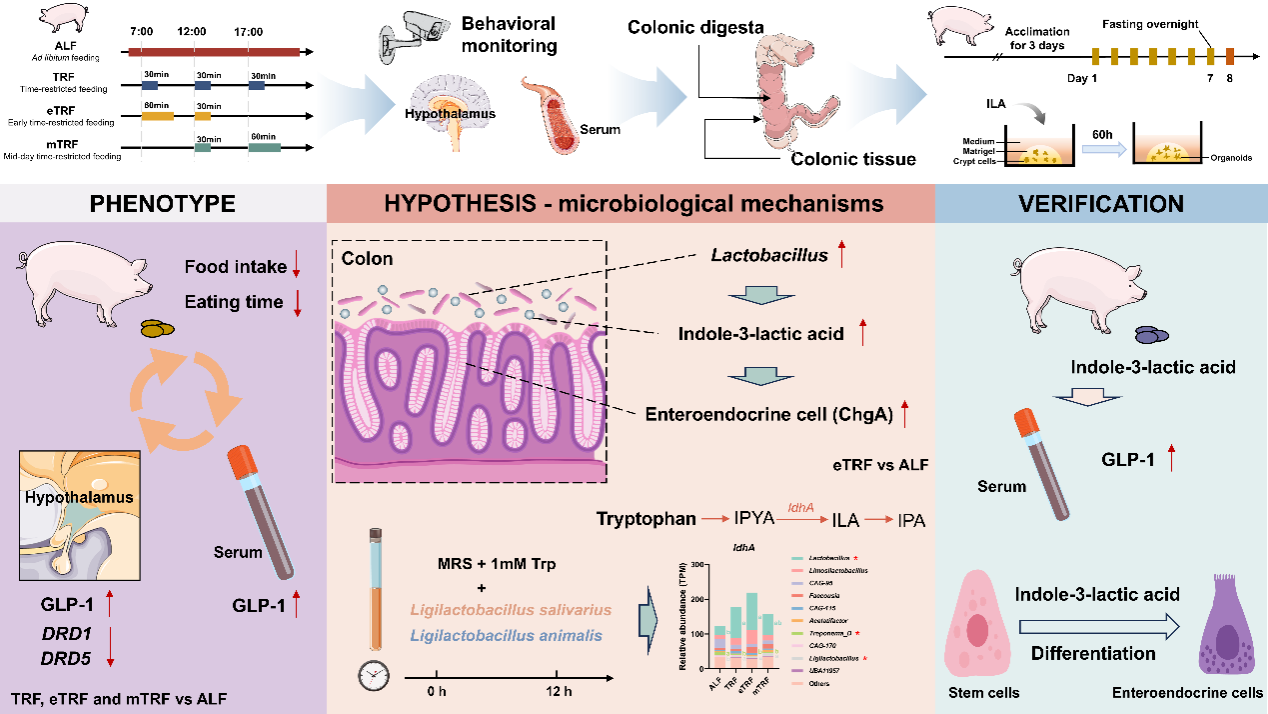 本研究以生长猪为模型进行限时饲喂试验,监测生长猪的采食行为,采集下丘脑组织进行转录组学测序,检测下丘脑与血清中胃肠激素的水平,明确限时饲喂影响生长猪采食行为的表型。结果发现,限时饲喂能够影响长期食欲的调节,具体表现为采食量减少、每日进食时间缩短、下丘脑和血清中GLP-1的水平升高,以及下丘脑奖赏相关通路受到抑制。为了进一步探究影响GLP-1水平升高的潜在因素,对回肠和结肠组织进行肠道干细胞和分泌型细胞的标志基因进行检测,利用宏基因组学测序和代谢组学测序技术对肠道微生物及其代谢物进行测定,挖掘介导微生物-宿主相互作用的关键分子。结果发现,与自由采食(ALF)相比,早间限时饲喂(eTRF)能够增加结肠内分泌细胞的数量,促进肠道内Lactobacillus定植,影响微生物色氨酸代谢,提高代谢物吲哚-3-乳酸(ILA)的水平。