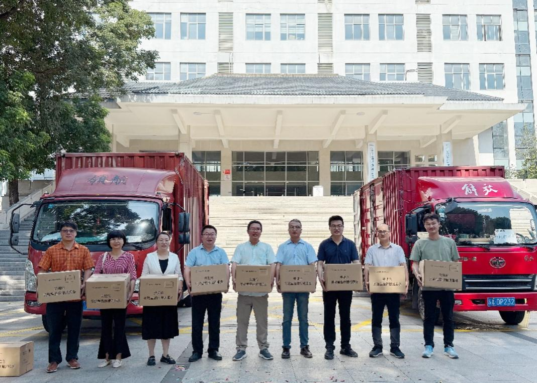 随后,早已准备妥当的运输车辆缓缓启动,自逸夫楼准时驶出,满载着学院的各类物资以及师生们的期许,沿着规划好的路线,朝着理科楼坚定前行。车辆到达之后,学院九位青年教师代表上前燃放礼花,以此表达欢迎与庆贺之意,并顺利完成物资交接工作。