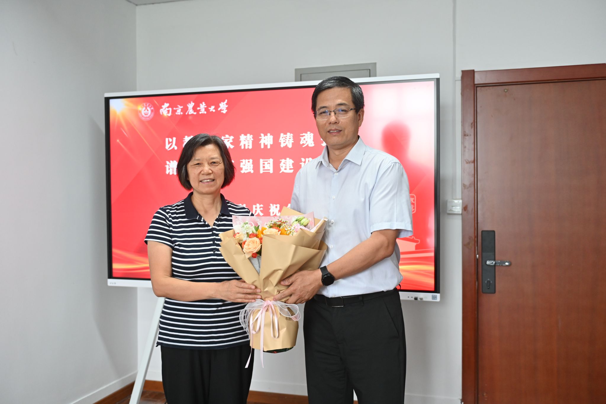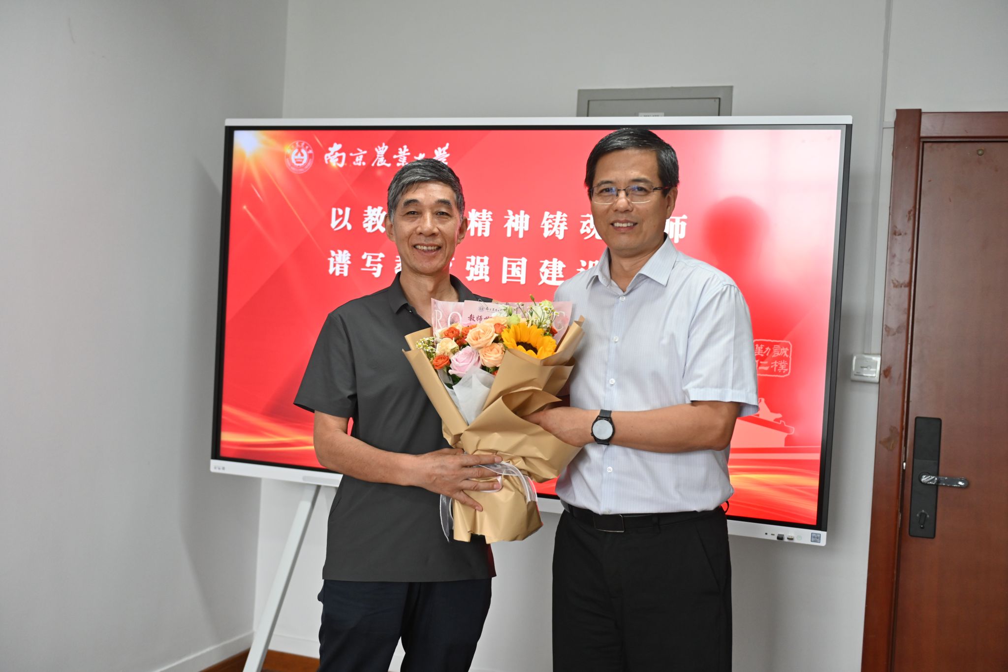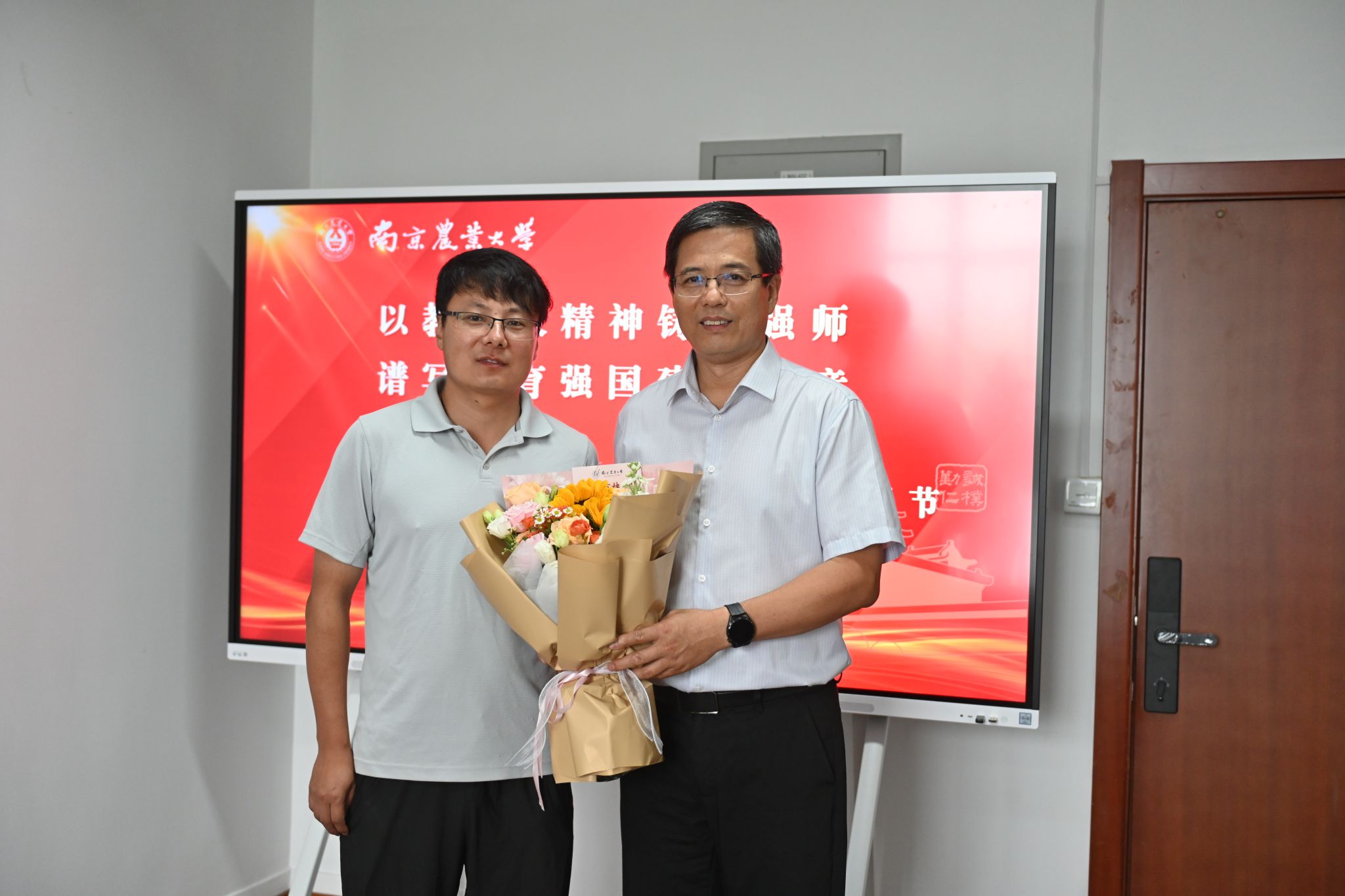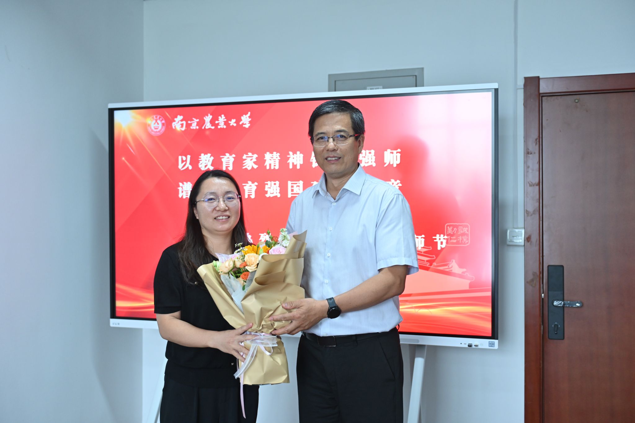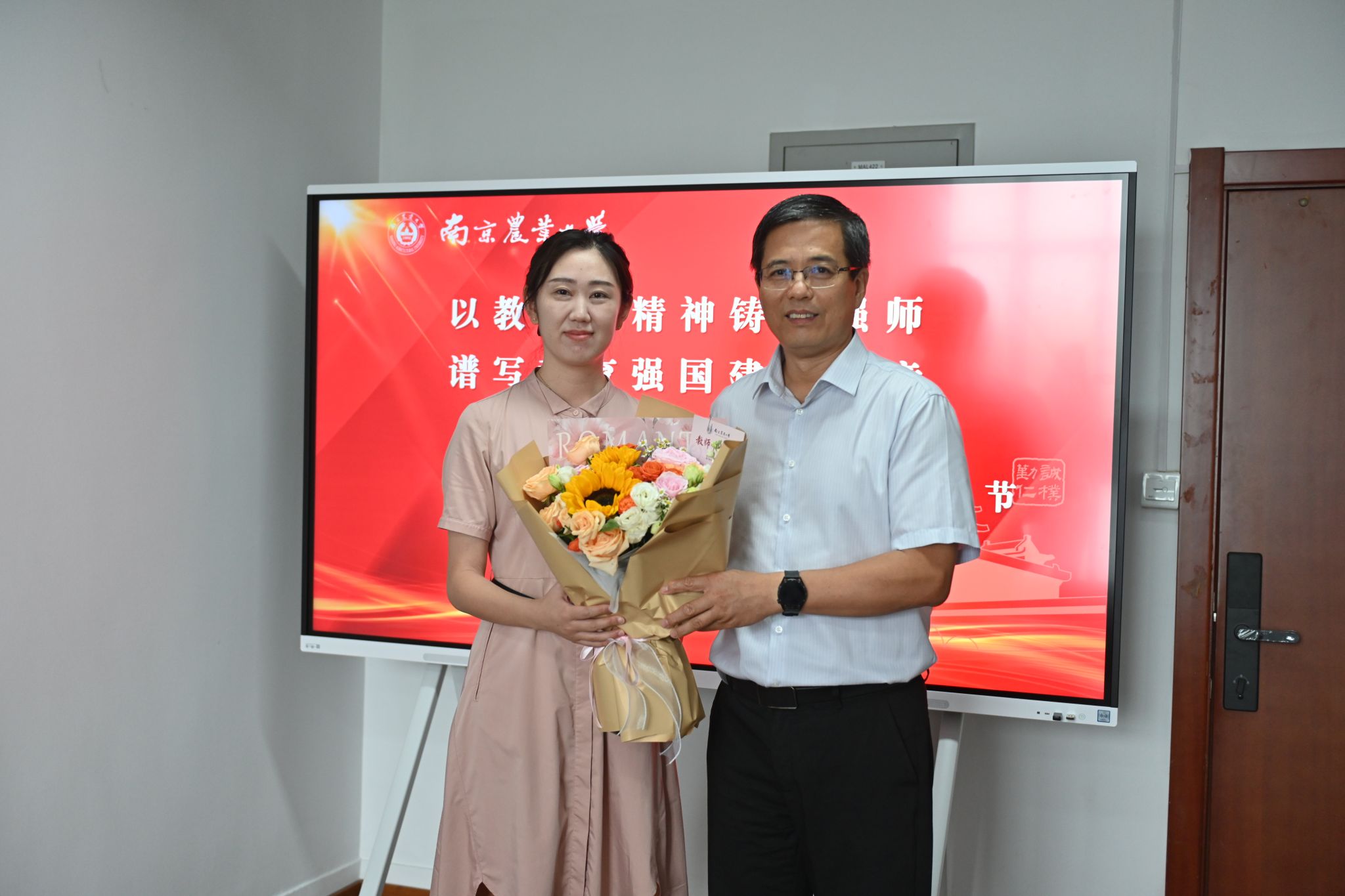 王源超副校长代表学校向朱伟云、庄苏、刘文斌、张艳丽、陈彦廷、王雪六位教师代表赠送鲜花,高度肯定他们在教学科研岗位上的坚守与付出,欢迎新教师入职,对各位教师为学校、学院发展作出的贡献表示衷心感谢。