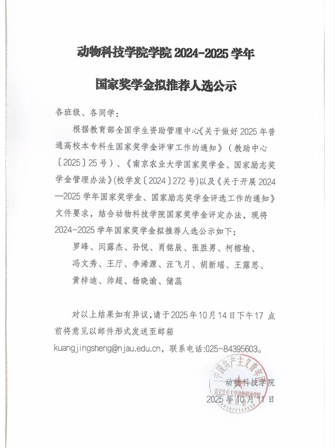 关于2024-2025学年国家奖学金拟推荐人选公示