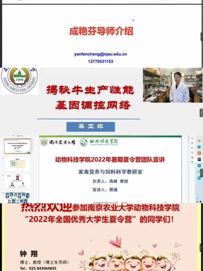 7月11号,在杜星老师和林焱老师的主持下,学院共有23位导师参与导师个人简介或团队简介环节。导师们分别从个人经历、团队组成、在研项目以及经验成果等方面向营员们详细介绍了动科院科研团队,帮助营员了解南农,了解动科,感受学院的实力与底蕴。