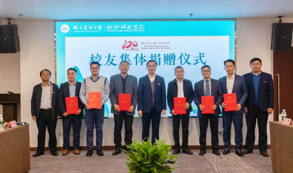 座谈会上,同时举行了校友集体现场捐赠仪式。南京诺齐生物科技有限公司董事长朱强、江苏福润德科技有限公司董事长李同军、上海易实生物科技有限公司董事长刘向阳、江苏敖众乐鲜生物科技有限公司总经理刘凌云、上海牛卓贸易有限公司经理符远明、南京全能肽生物发展有限公司总经理孙尚智等6家企业及个人共向学校捐赠144万,闫祥林为他们颁发捐赠证书。