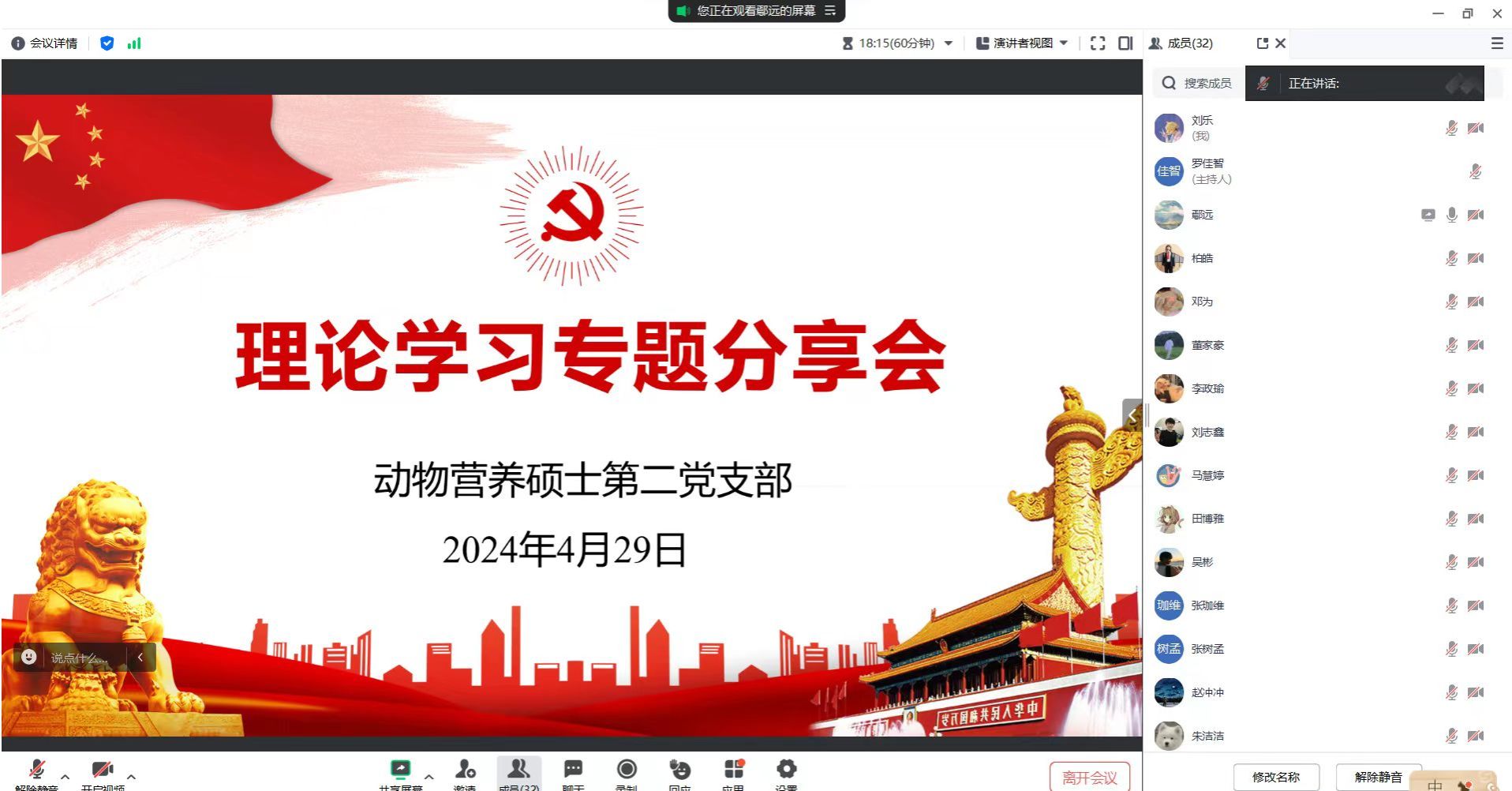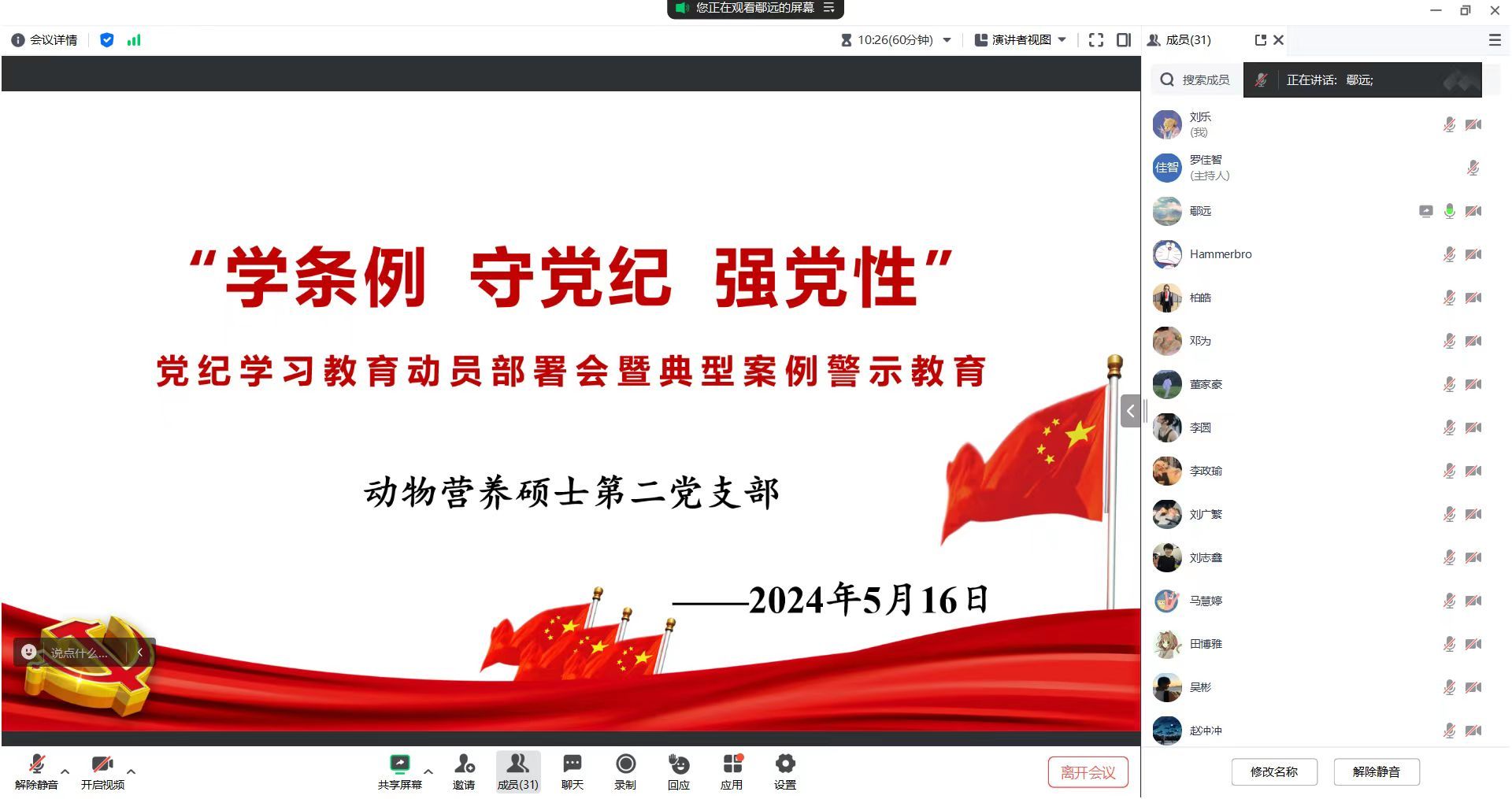 5月16日,必赢线路检测3003动物营养硕士生第二党支部开展党纪学习教育部署会暨典型案例警示教育活动,结合此时间毕业生党员忙于答辩及多数党员同志外派试验,会议形式采取腾讯会议线上举行。会议参会人员达34人,支部同志均就位。